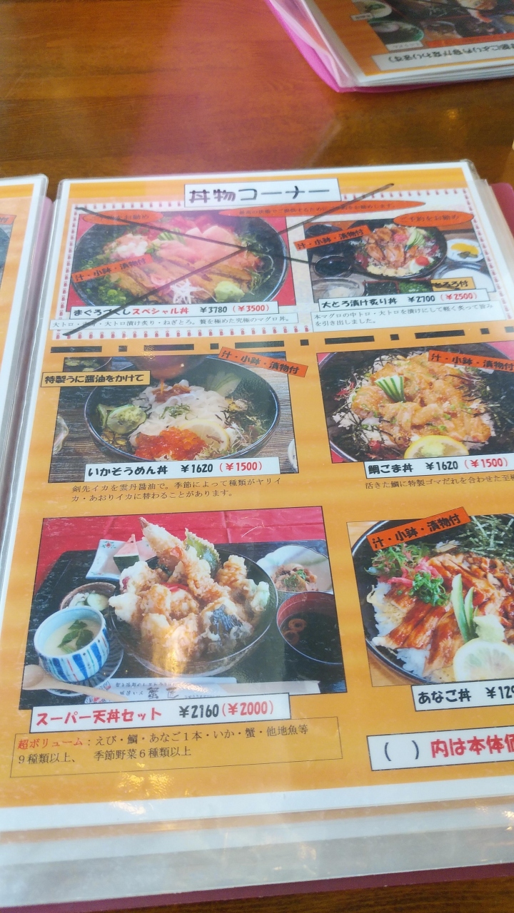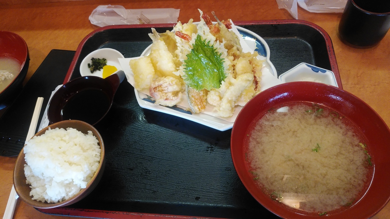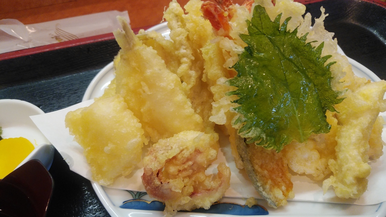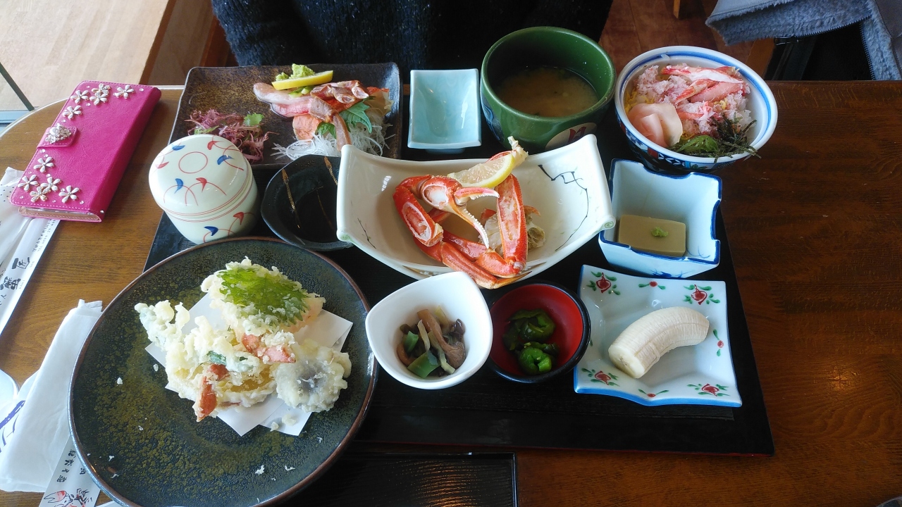 日は妻が以前から蟹が食べたいと言っていた事を思い出し、朝9時に島根県の浜田市にあるお魚センター二階の「蟹匠」にランチを食べに行きました。実は前日のテレビで「蟹匠」が紹介されのに刺激されました。到着したのが12時30分頃でしたが、平日なのに結構お客が入っていました。テレビで紹介された「カニ三昧定食」を食べるつもりで来ましたが、メニューが豊富で目移りして、私は「スーパー天丼セット」を注文。妻は食べたかった「カニ三昧セット」を注文。沢山のメニューはどれも美味しそうでした。カニ三昧は少し小振りでしたが、この値段ではお得です。また、スーパー天丼は9種類以上のエビ、あなご、蟹、イカ等がてんこ盛りで御飯を探すのが苦労する位で、ボリューム満点で非常に満足して帰りました。ほぼ1日かけて訪れた甲斐がありました。