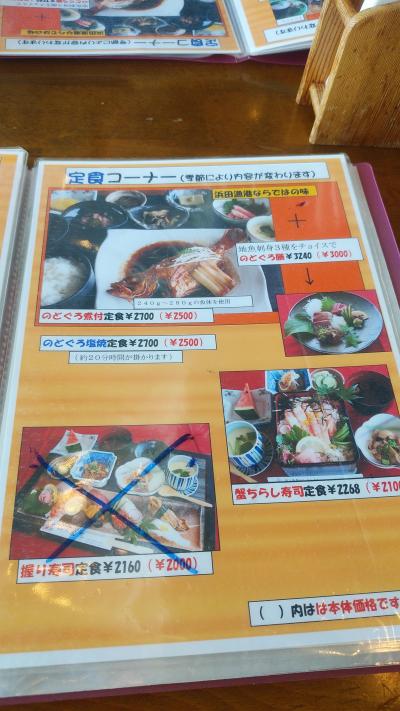 今日は、ゴルフ友達に浜田に地元で有名な「のどぐろ」の美味しい店があるというので行って見ました。ここは「しまねお魚センター」の近くにある浜田市公設水産物仲買売り場の2階にあり、外にある階段でしか行けないそうです。目玉は高級魚の「のどぐろ炙り丼」でリーズナブルだそうです。2階に行って見ると愕然、金曜日は休みだそうです。