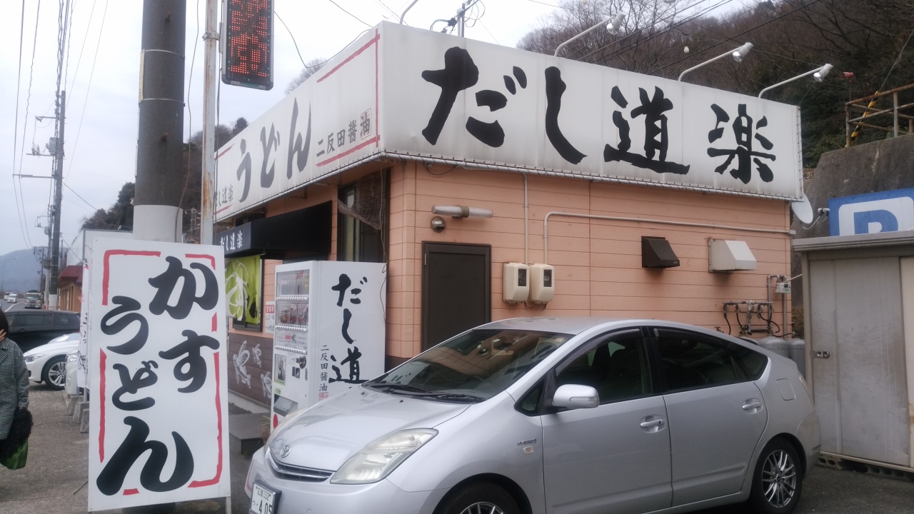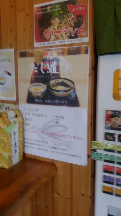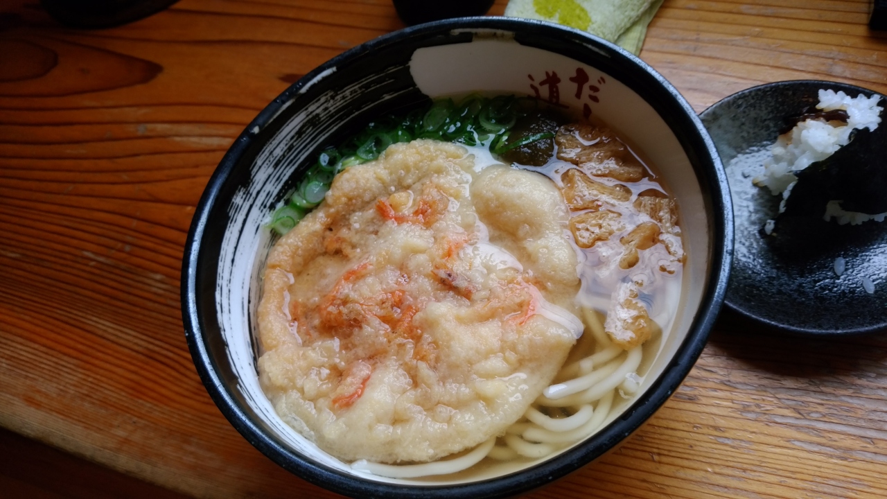 呉で有名な「だし道楽」というコジンマリしたうどん屋にいってみました。かすうどんが有名で、かす=牛ホルモンが入り、飛び魚を炭火で焼いた「焼きあご」を一匹いれたつゆの基に呉特有の細麺が美味しいと評判のお店です。この出汁は自販機で販売されています。今日はかすうどん定食と天ぷらうどんとおにぎりを注文。自動販売機で食券を購入しますが、かすうどんは若干高めで、店内も狭いので多くの人数は入れないので注意が必要です。