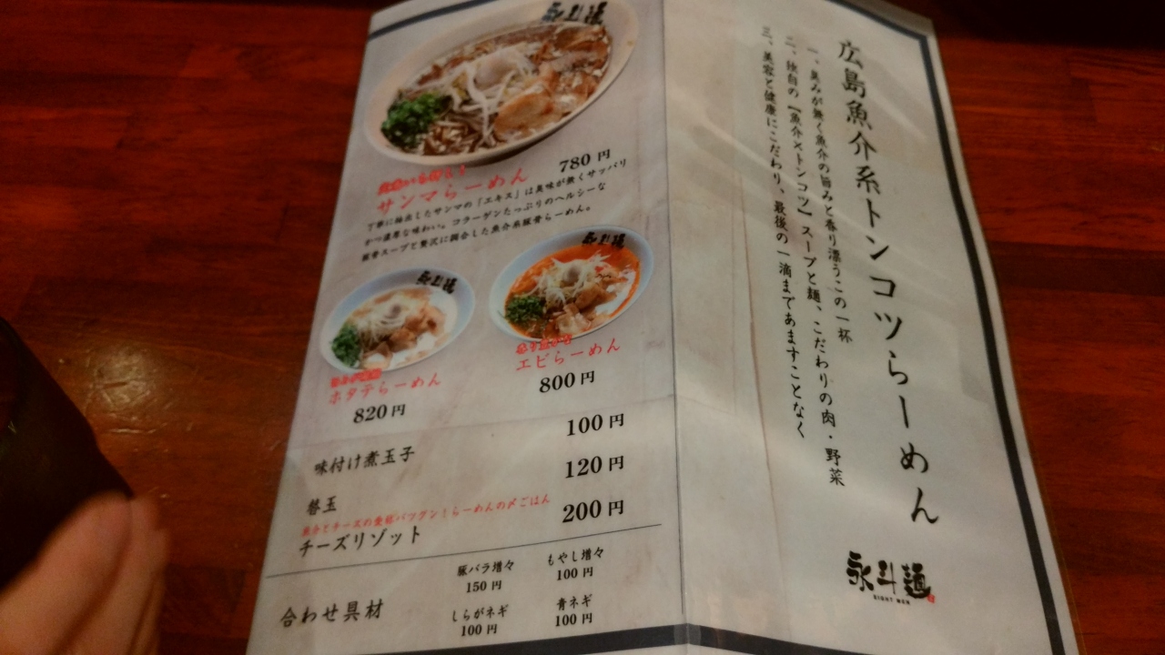 休暇でNYから一時帰国した息子が広島市内で所要を済ませて合流した時に、何処で聞いてきたのか魚介類スープ美味しいラーメン屋があると聞いてきたので行って見ました。息子と合流したのが15時前だったので電話すると、15時30分がオーターストップというので急いで行きました。息子曰く、魚介類スープを使っているラーメンは美味しいそうです。息子と女房は「さんまラーメン」、私は「あぶら麺」を注文。両方とも今迄食べていたラーメンとは違って絶品でした。「さんまラーメン」も美味しかったですが、スープが殆ど無い「あふら麺」は今迄味わった事のないラーメンで、私にはあっていたのか非常に美味しく、リピーターになりそうです。唯一の難点は紙屋町なので、車を駐車場に入れて徒歩でいかないといけないという事です。