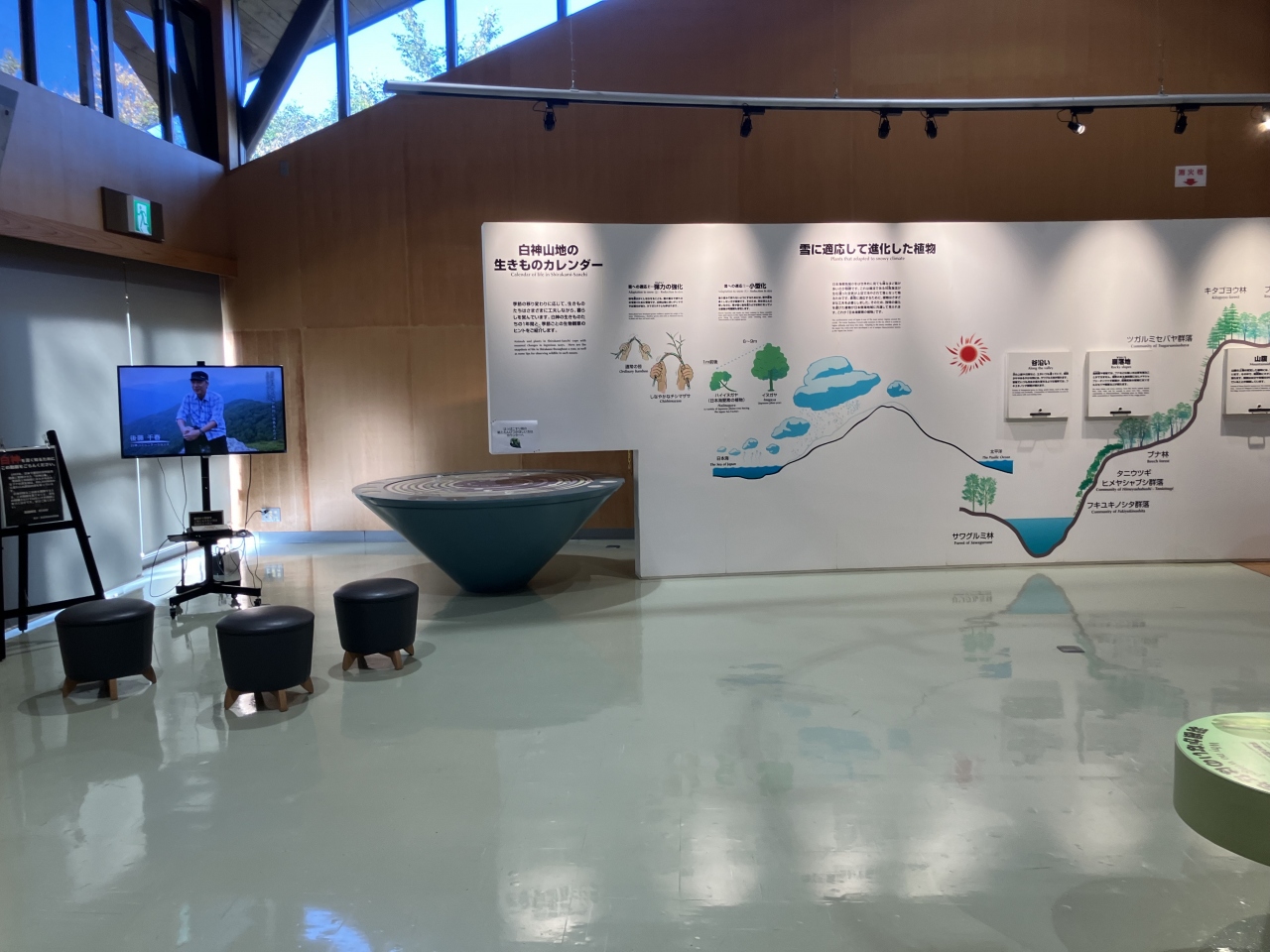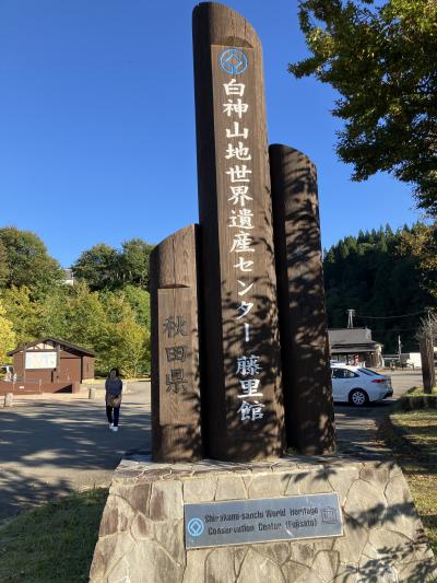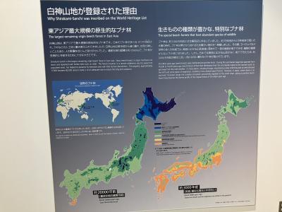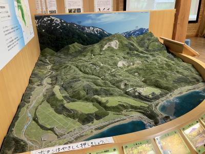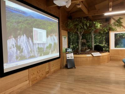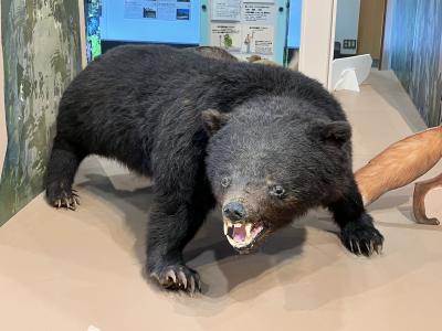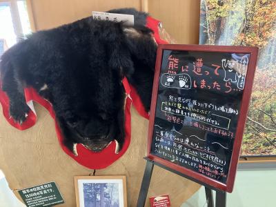 十二湖及び青池を観光して世界遺産白神山地ブナ林観光を目指したものの、通行止めで行けなかった代わりに、国道101号線を約90Kmを引き返して八幡町から白神山地世界遺産センター藤里館まで50km走行して行きました。今日は連休ですが人は多くなくゆっくり鑑賞することができました。入口には熊の剥製がかけてあり「熊に遭ってしまったら」の看板に注意事項が記入してありました。館内には「世界遺産登録までの歩み」「白神山地が登録された理由」「雪に適応して進化した植物」「白神山地の生態系」の説明が掛けられたり、