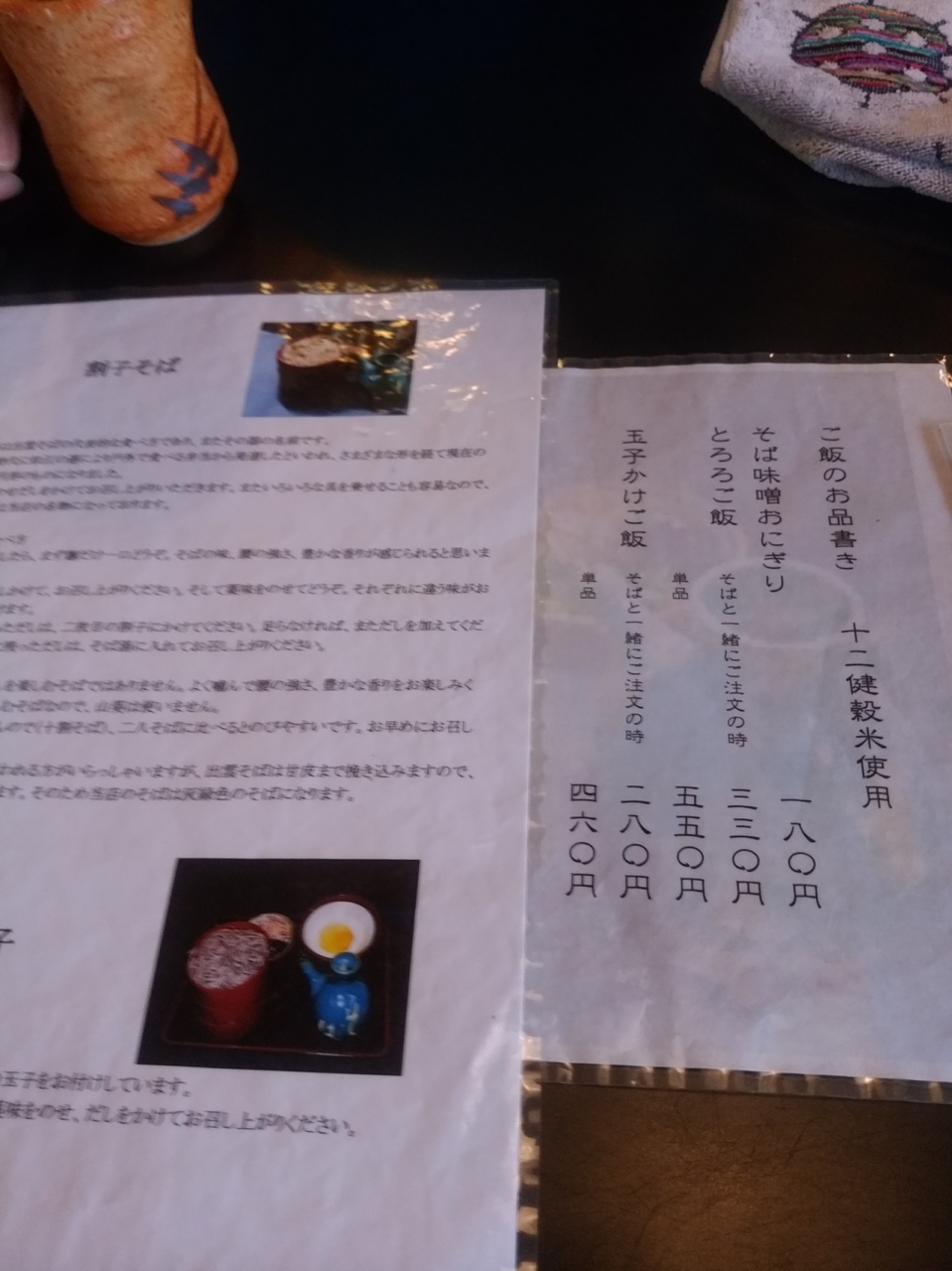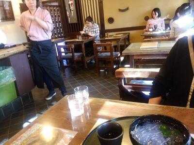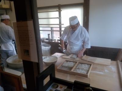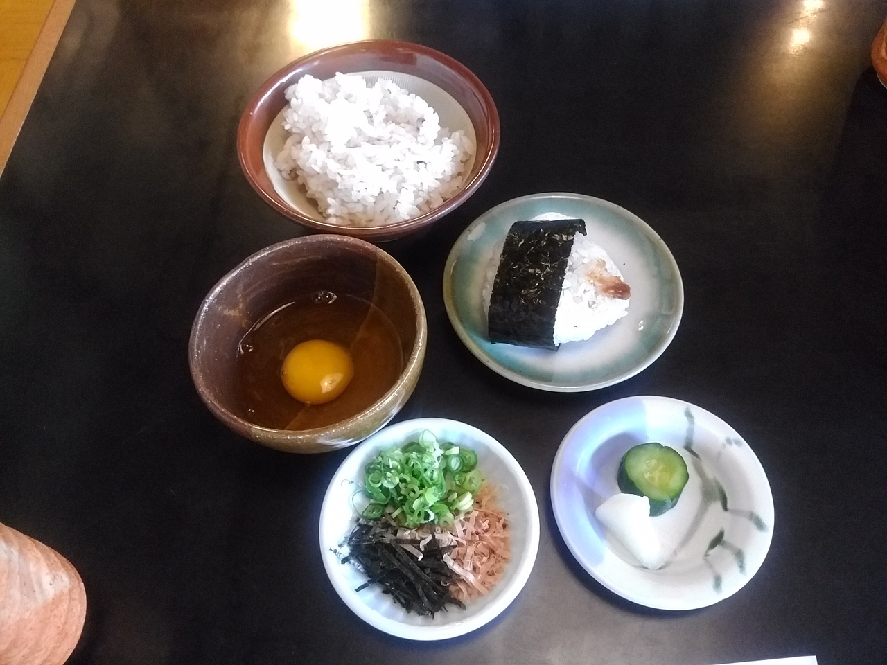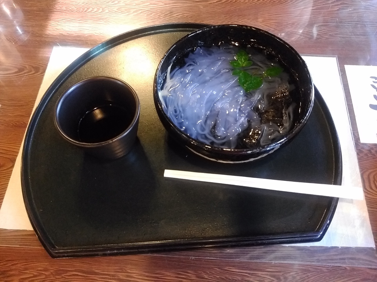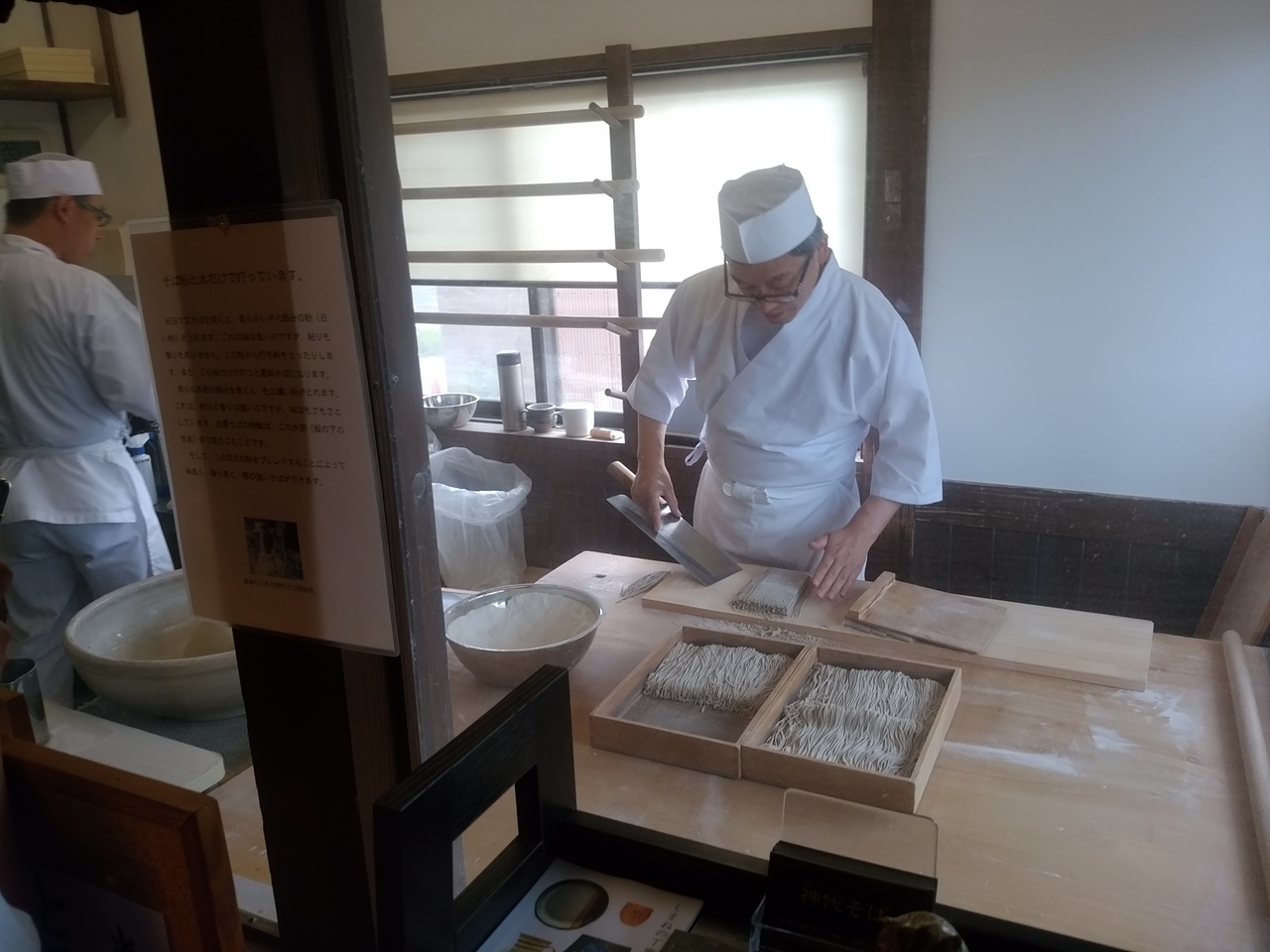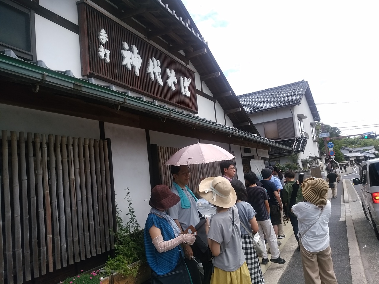 4時間かかり10時半に着いて県庁駐車場に車を停めて1番近い「ふなつ」と言う蕎麦屋に行きましたが、盆休みだったので「神代そば」に行きました。車で行ったのですが8台しかない駐車場が満車だったので、少し待ちましたが車の通行が多く県庁駐車場に停めて歩いていきました。着いたのは時間は11時40分でしたが、最初に行った時は行列はなかったのに、30人程まって入店すると店内でも並んでいたので、蕎麦をたべたのは13時20分。名物の「とろろ割子そば」と「そばみそおにぎり」「玉子かけごはん」を注文。出雲蕎麦はよく噛んで腰の強さ、豊かな香りを楽しむそうで、山葵は使わないそうです。少し細めの国産の、松江市産玄丹そば在来種十二健穀米だそうです。松江に蕎麦は何十回と食べにきましたが、待った甲斐があり美味しかったです。また、食べ方説明やお茶のサービスも良かったです。