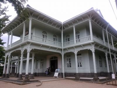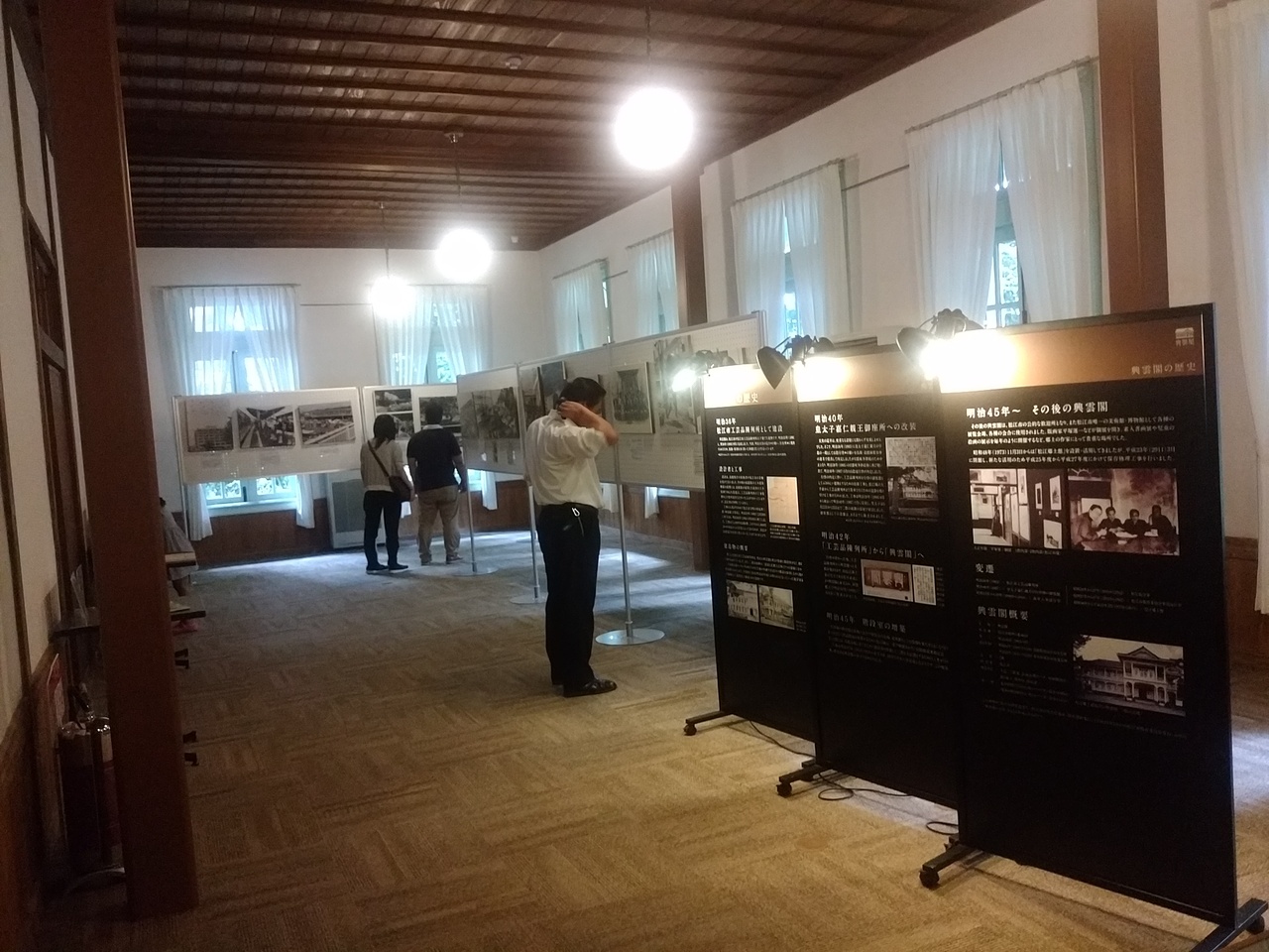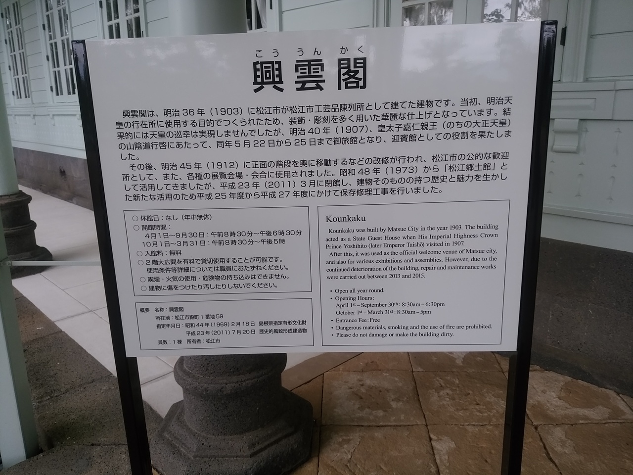 明治36年に松江市工芸品陳列所として建てられました。当時、明治天皇の行在所に使用する目的で造らた為、装飾・彫刻を多く用い華麗な仕上となっています。しかし、天皇の巡幸は実現しなかったそうです。入館料は無料で2階の大広間は貸切中で見学できませんでしたが、1階入り口近くに喫茶室があり飲食ができます。その奥には明治から最近までの写真やせつが展示されており、松江の歴史が良く解り勉強になり良かったです。