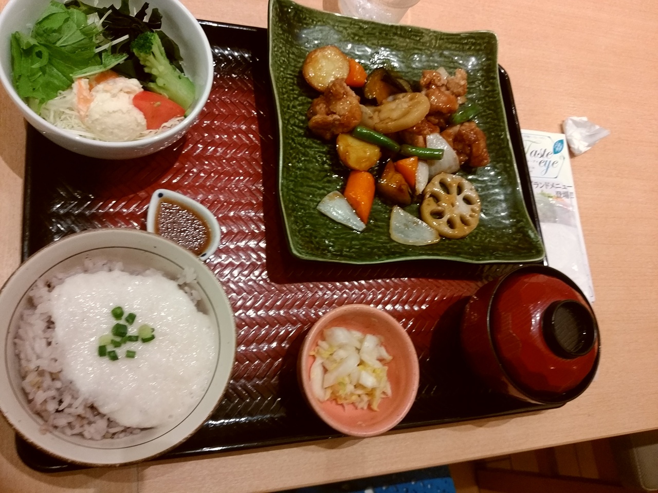 今日は妻の眼科受診日なので、受診後に妻の好きなゆめタウン呉に買いものを兼ねて、3階にある大戸屋に食事に行きました。大戸屋はお母さんの味を謳っているので年配者に人気があるらしく、昼時は待つ事が多いです。黒酢鳥あんかけと味噌煮込み定食を注文しましたが、注文は大体決まっていて、好きな料理を繰り返し食べているので美味しかったです。