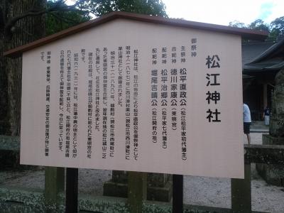 松江の有志によって松江直政「松平家初代藩主」を御祭神として、明治10年創建。その後明治30年に東照宮の御神霊を合祀した為、合祀神は徳川家康と言う由緒ある神社ですが、この地方で主祭神が神ではなく、藩主と言うのも珍しいと思います。家業繁栄、厄除開運、交通安全の御加護が特に顕著で、天守閣に登る階段の横にあり、時代を感じる場所で良かったです。