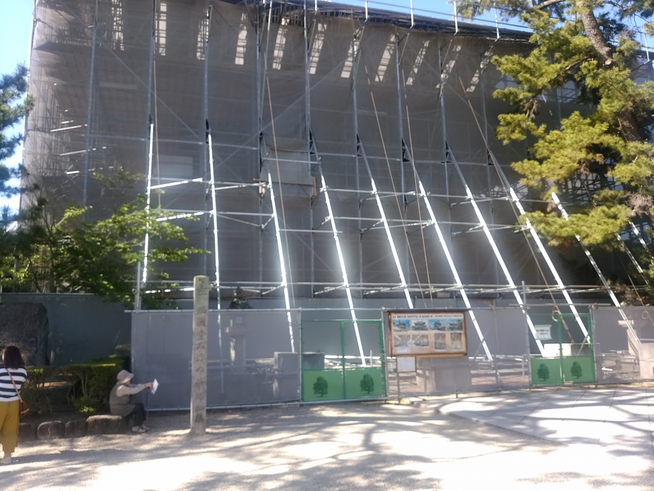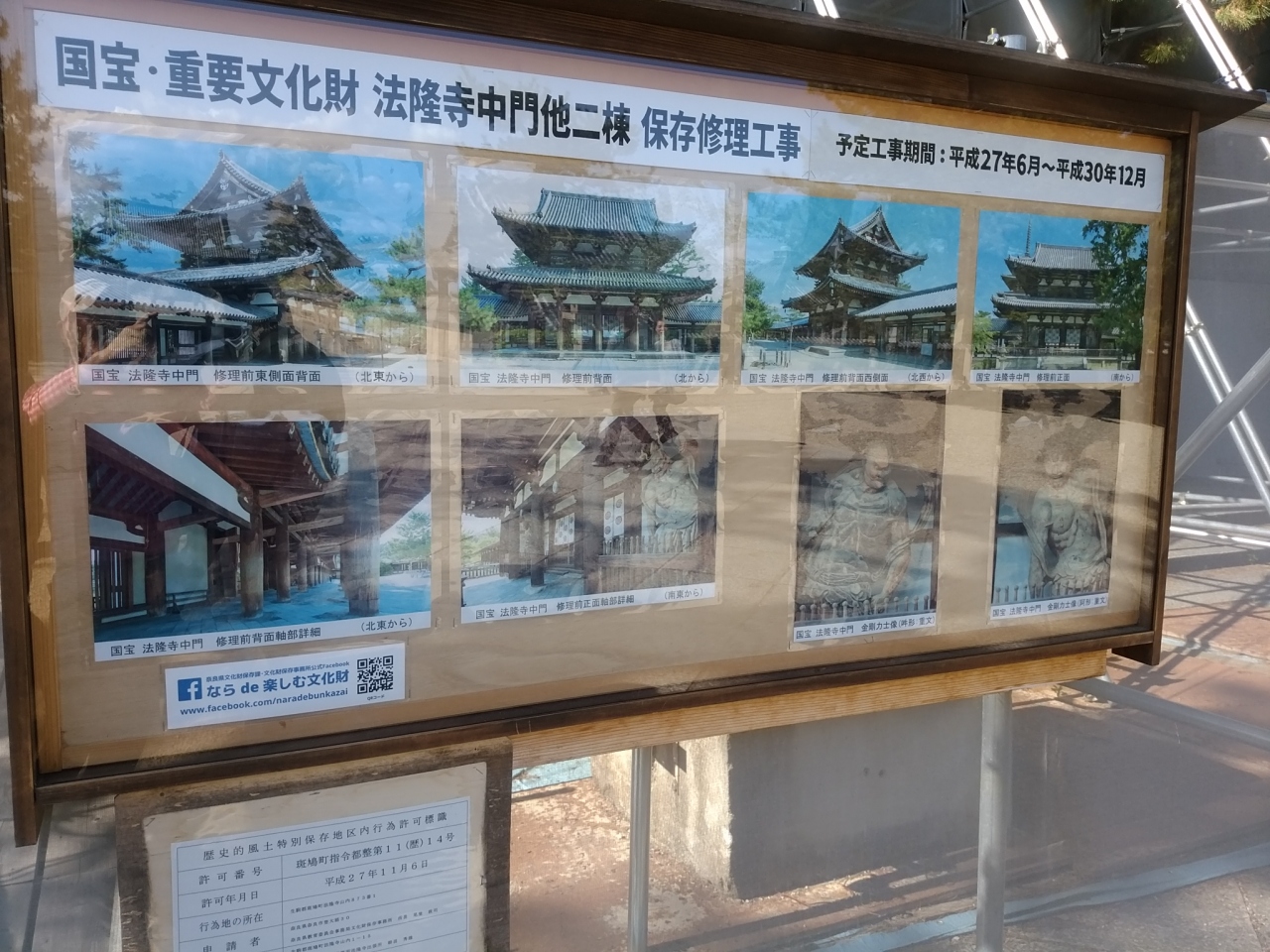 法隆寺の南大門近くの駐車場に車を預けて(1日500円)、南大門を通り西院伽藍の入口である中門に行くと、全体をシートで覆って工事中で見られませんでした。5月の大型連休中に興福寺も工事中で見れない場所があるのは残念でした。工事期間は27年6月~30年12月になっていたので3年半も見れません。見学が出来ない為か、修理前の東側側面背面、背面、背面西側側面、正面、背面軸部詳細2枚、金剛力士像2体の写真が展示されていました。私達は過去数回訪れているので写真で思い出しますが、初めて訪れた人は残念でしょうね。是非工事終了後に訪れて下さい。
