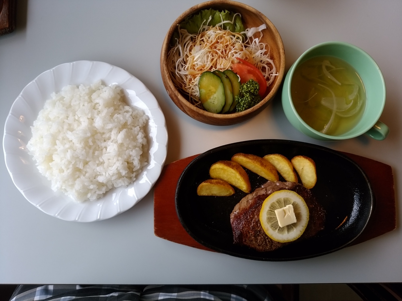 口コミが良かったので行って見ました。片道3時間でしたがドライブも兼ねて出発。開店11時前に着くも、店内は暗く準備中の札がかかっていましたが、店の前から電話すると11時過ぎに開店するとの返事だったので11時10分位にはいると3組が注文していました。皆さんステーキセットを注文していたので、ステーキセットを注文(1080円税込)。セット内容はごはん、スープ、サラダ、ステーキと小芋。ステーキは厚さが3cm以上あり期待大。でも全員焼き方を聞かれなかったようでミディアム。中心は少しレア。注文時にウェルダンで注文した方が無難だと思います。3cm以上あるステーキですが、食べてみると何枚かを重ねて厚くしている様です。ま1000円ですから文句は言えませんけど。個人的にはウェルダンで焼いて食べたらもっと美味しかったとおもいました。