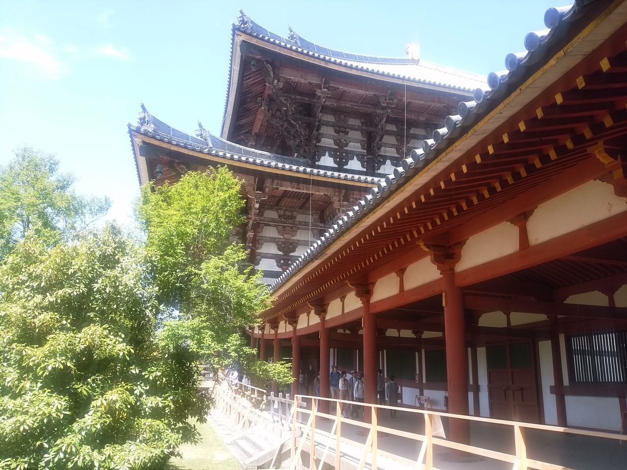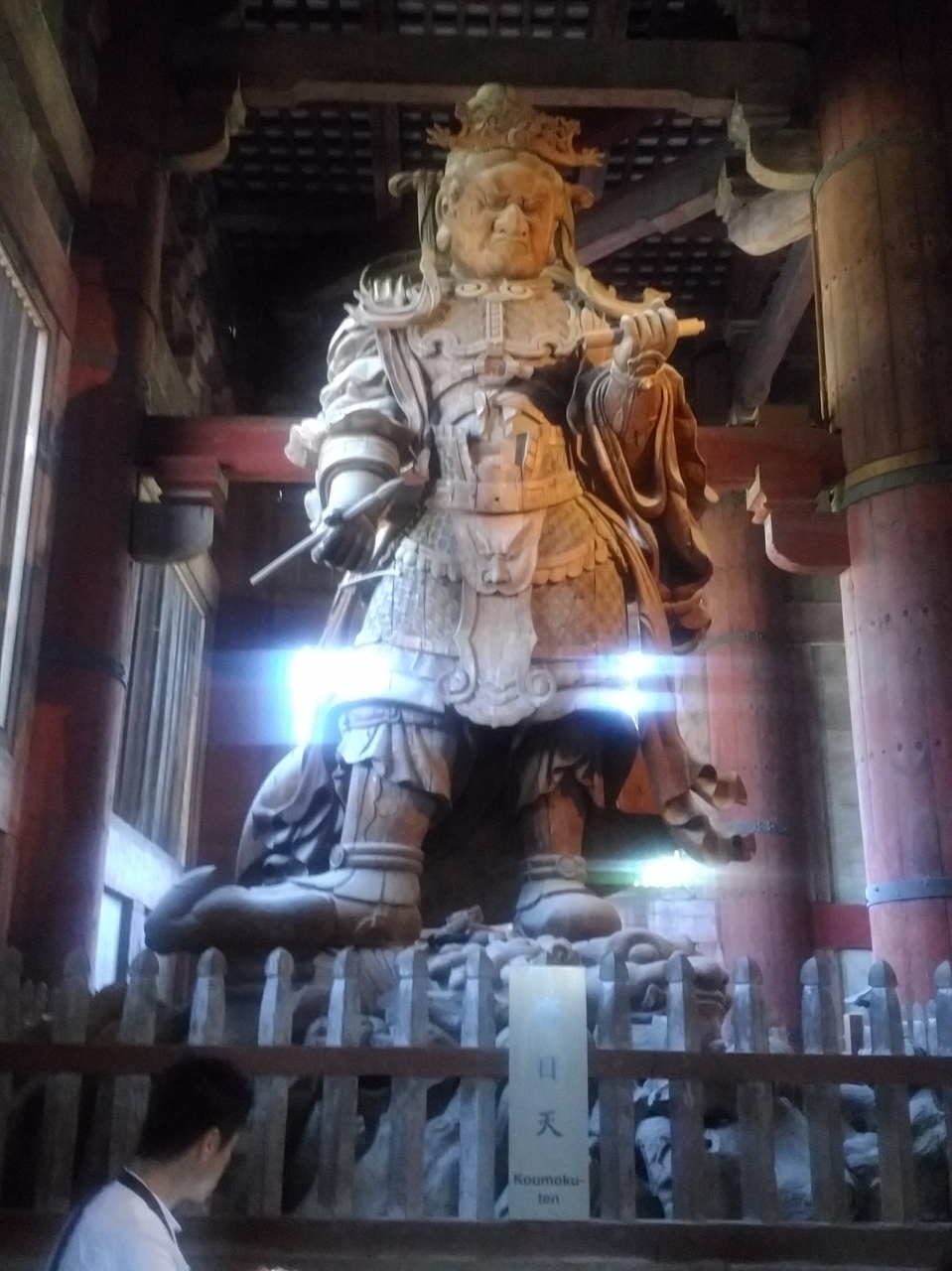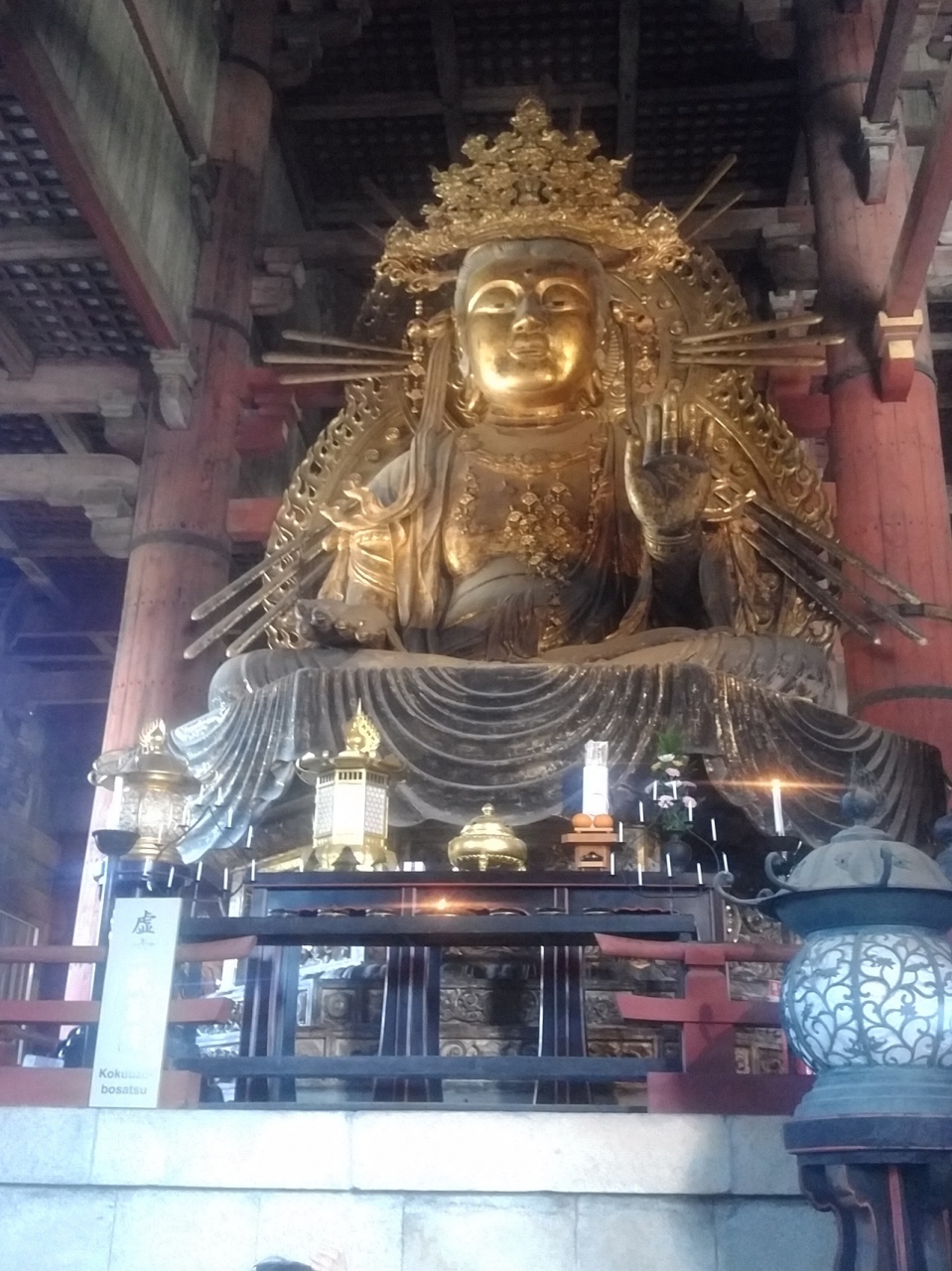 朝9時過ぎに東大寺について、駐車場に近い戒壇堂、大仏池、指図堂、鏡池、中門と観光する頃には、観光客が芋の子を洗う位大勢になっていました。最近の傾向として外国人観光客が何処に行っても多いです。大仏殿の前に八角燈籠があり、4枚の羽目板が付いていて楽器を演奏する音声菩薩がリレーフされておりますが、西北面と南面だけが本物だそうです。結構大きいものでしたが、大仏殿が大き過ぎるので見逃すかも。国宝にしては珍しく撮影自由で、堂内正面に廬舎那仏があり、両脇に金ピカの如意輪観音と虚空蔵菩薩坐像が鎮座し、奥には四天王像の内2体が安置されていました。手口付近には、大仏の鼻の穴と言う大きな穴が空いている柱があり、この穴を潜るのが人気なのか長い行列が出来ていました。この穴を通ると邪気を払われると云われ、鬼門の場所にあるそうです、2~3回訪れてますが、今回はゆっくり見る事が出来、息子と娘達に身代わり教珠と言う御守りを買って郵送しました。若い時と年を取って又