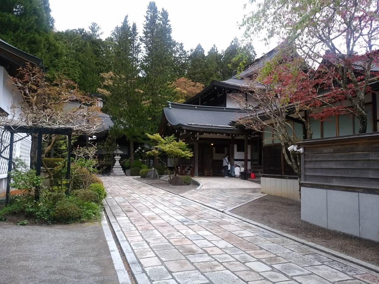 金剛峯寺を含む駐車場が朝の9時に到着したにも係らず空いておらず、高野山大学の臨時駐車場にやっと駐車し歩いて降りると、目の前に総本山金剛峯寺の壮大な山門がありました。表門を入り主殿、別院と観てまわりましたが、壇上伽藍に次ぐ広さで見る処全てが新鮮で良かったです。秀吉亡き後、母公の菩提を弔うため剃髪が納められたので剃髪寺と名付けられていたそうですが、その後青厳寺と呼び大火により焼失した為再建され金剛峯寺と改名したそうです。それにしても入口の山門の景色は良かったです。昔は天皇や皇族や高野山の重職に限られていたそうで、一般の僧侶は階段上の右にある小さな入口から出入りするそうです。