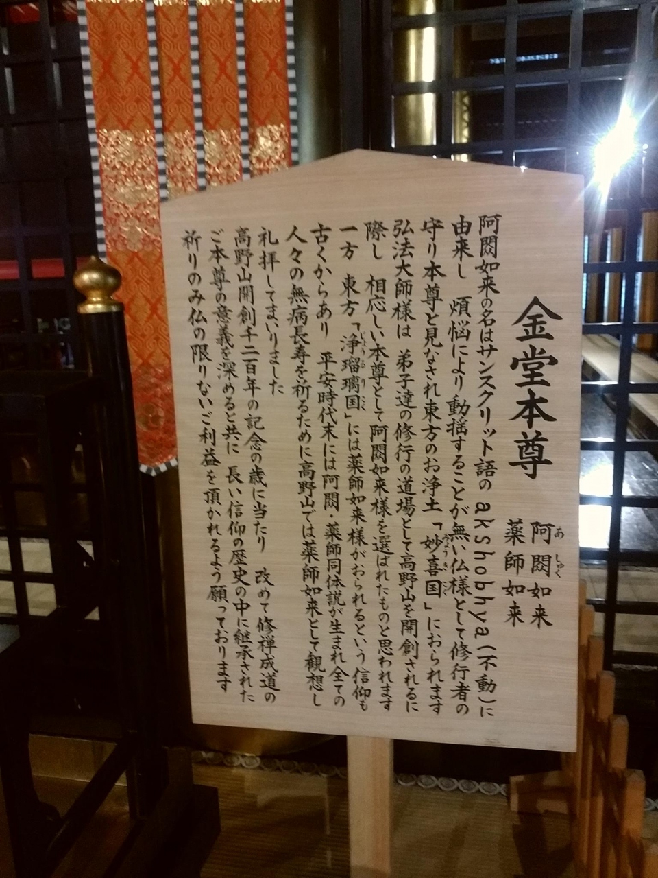 壇上伽藍の中門を潜ると正面に大きな建物があるのが金堂で、山内で最古の歴史を持つ建造物です。現存する建物は7度目の再建で昭和7年に完成し、本尊は高村光雲作の薬師如来、阿あしゅく如来であしゅく如来はサンスクリット語の不動に由来し、煩悩に同様する事がない仏として修行者の守本尊と見なされ、修行道場として相応しい本尊で、浄瑠璃国ににおられ無病長寿を祈るとされているそうです。又薬師如来は秘仏となっており、御開帳の時以外観る事は叶わないそうで、写真中央の厨子に収納されているそうです。高野山焼き討ち等の歴史を思い浮かべましたが現存の建物が鉄筋コンクリートとは意外でした。