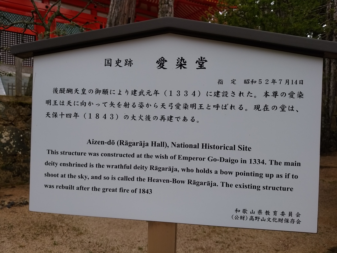 壇上伽藍の根本大塔と東搭の間にある三つのお堂の1つで、本尊は恋愛を司る仏として知られている愛染明王は後醍醐天皇の御等身と云われ、後醍醐天皇の命令により四海静年、玉体安泰を祈る為に建立されたと云われています。本尊の愛染明王は愛を成就され愛情に満ちた幸せな生活をもたらしてくれる神様なので、若いカップルや年配夫婦も多く訪れていました。また、壮大なパワーがあり多くの歴史上の人物が守護神としたそうで、愛の成就や恋愛の達成、異性との出会いに絶大な効果があると云われているそうです。