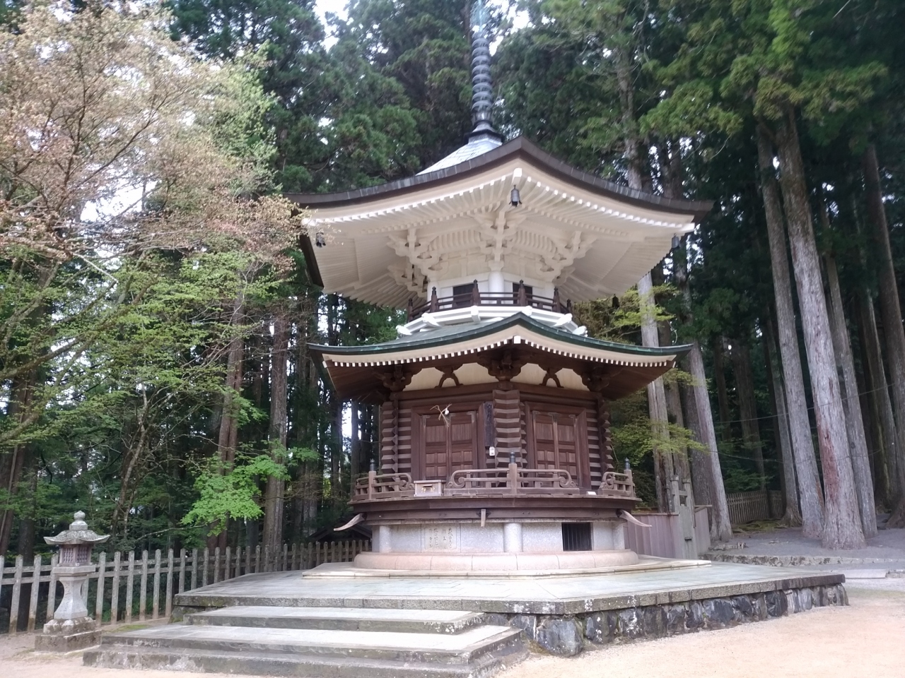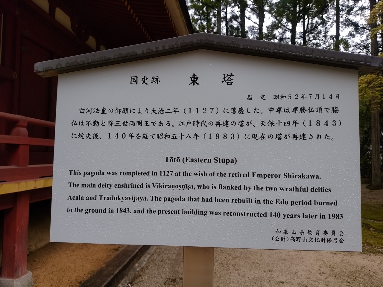 壇上伽藍の中にある東搭は後白河法皇の発願で京都の醍醐三宝院の勝覚の手により造営された二重搭です。天保14年の高野山大火災で焼失し昭和59年の「弘法大師御入定150年御遠忌記念」の記念事業として再建されたそうで、割と新しく朱塗りで綺麗でした。本尊は「尊勝仏頂尊」で脇侍として両脇に「不動明王」と「降三世明王」がお祀りされているそうです。が降三世明王は聞いたことがあのそうで無さそうですが、インドヒンドゥ教の最高神「シバ神」とその妻である「パールヴァティー」だそうです。若い頃に読んだ漫画に出てきた名前と同じ事を思い出しました。高野山色々な神やインドの神まで非常に面白く興味が尽きない地となりそうです。
