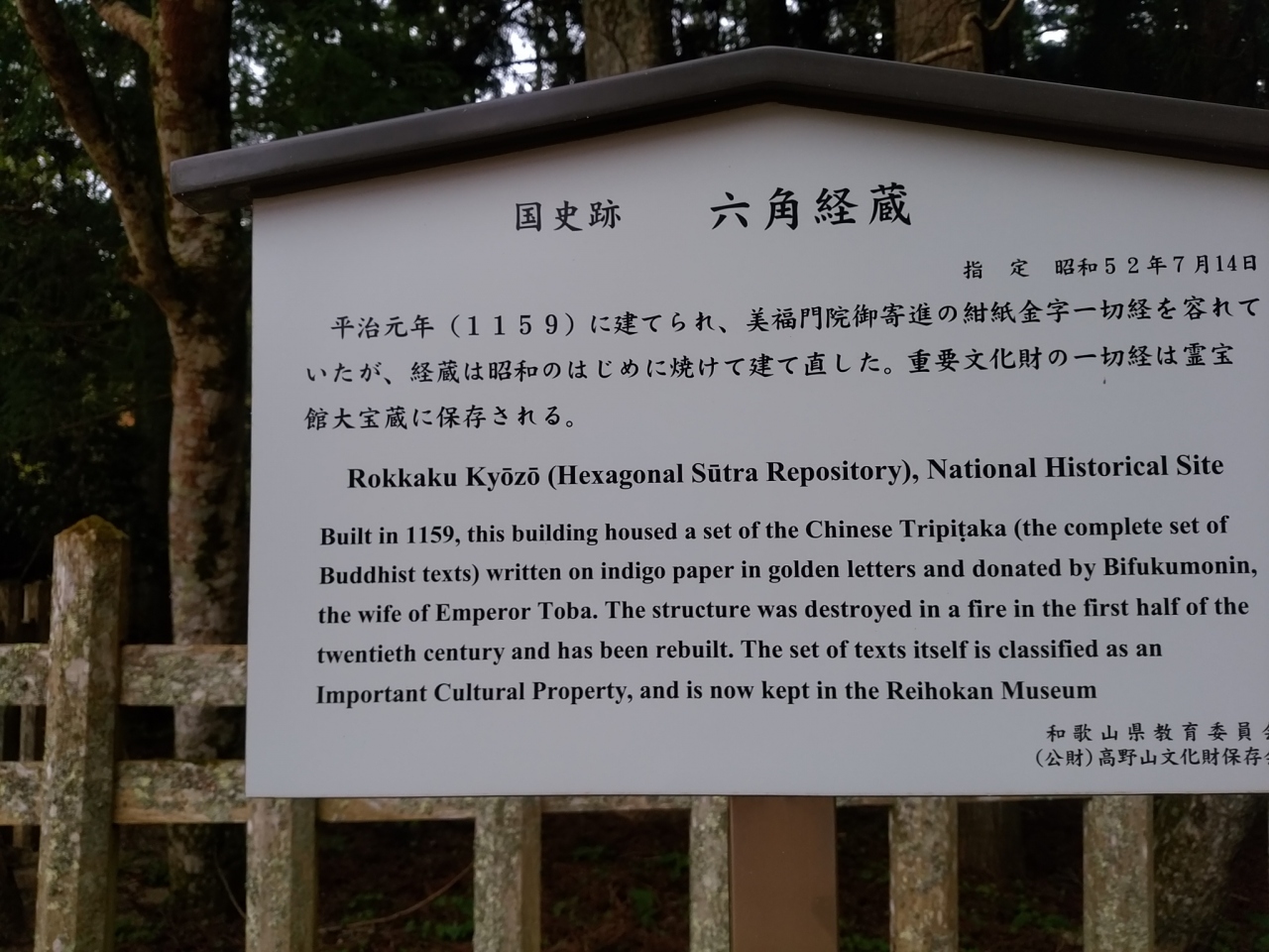 壇上伽藍の中にあり、美福門院は鳥羽法皇の后として権勢を篩い保元の乱の原因を作ったと言われており、紀州荒川の荘園を寄進した事から荒川経堂とも呼ばれているそうです。昭和9年に再建されたそうで、地面から少し高くなっている基礎の上に把手がついていて押すと回転することができ、時計回りに一周できます。私達の地元である宮島にも同様なものがあり、一切経を読んだのと同じ功徳を得られるそうで、チベット仏教のコルラ、又はマニ車と似た意味合いを持っているそうで、行く場所行く場所で興味が尽きない程よい場所でした。