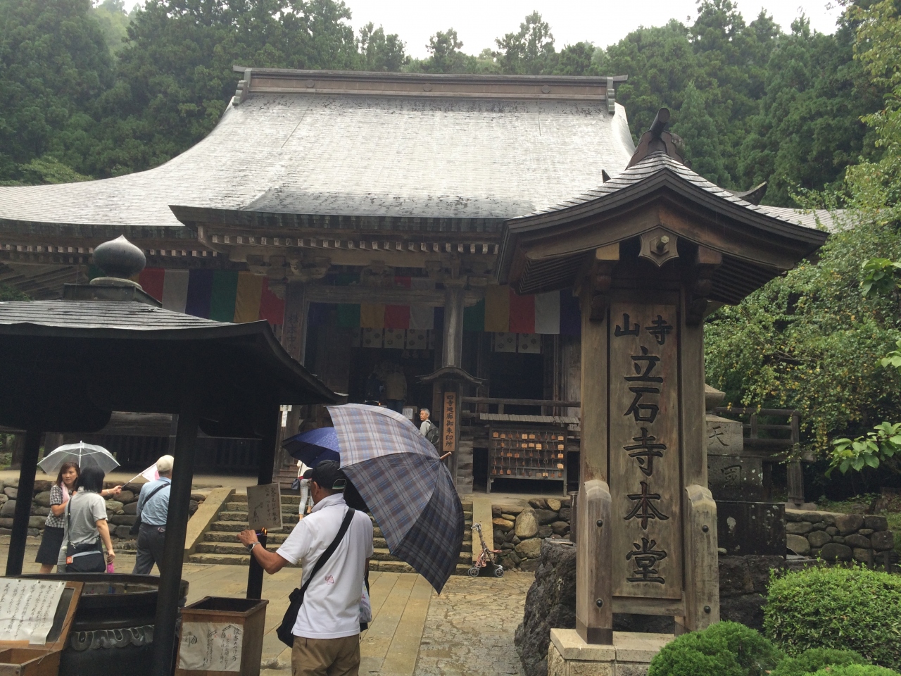 立石寺入り口に名勝・史跡 山寺と刻印されている石柱の階段を登った処に本堂があります。立石寺本堂の小さな櫓がある正面になります。私達が参拝している時に団体が来てすぐにごった返しました。結構雨が降っているのに団体も個人も傘をさして多くが登っていってました。以外と閉山堂や奥ノ院が色々な旅行誌や旅番組で有名なので、本堂が平地の入り口近くにあるとは以外です。
