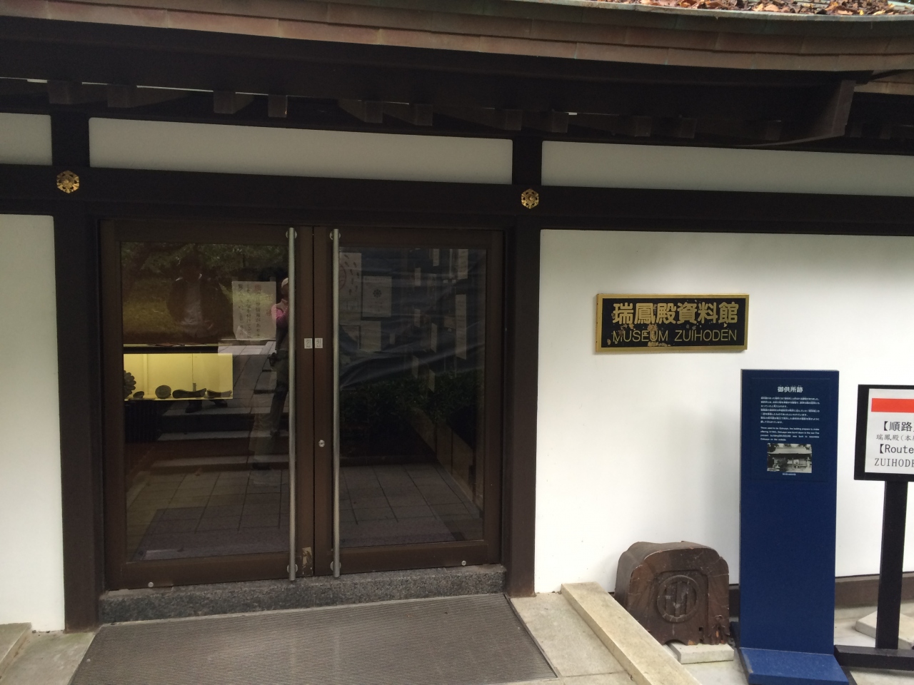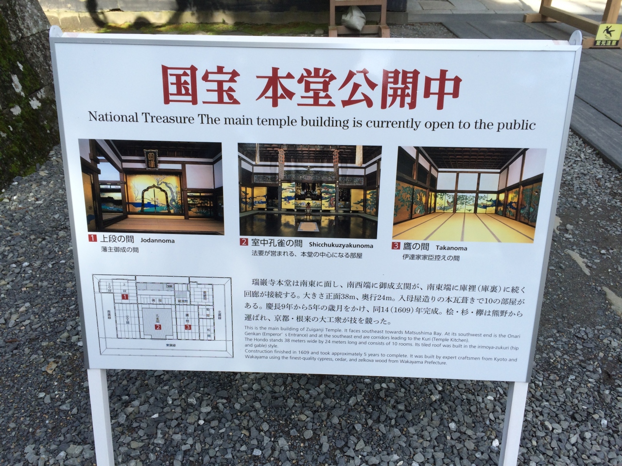 国宝瑞厳寺を観光、でも結構工事か多く門から入れず右の岩を掘った洞窟遺跡群を通って墓を見ながら参拝料徴収所へ、徴収所左には法身窟と呼ばれ右に楊柳観音左に鎮座海観音の石碑がありました。それから工事中の壁にお寺の色々な写真が壁に張ってあり本堂へ、本堂は撮影禁止ですが、室中孔雀の間と呼ばれる法要の部屋、二代忠宗の位牌を安置した仏間、文王の間、上段の間、上々段の間、羅漢の間、墨絵の間、菊の間、松の間、鷹の間等見て回りましたが、素晴らしいものでした。本堂を出たお坊さんに寶華殿の場所をききましたが、震災により本堂修理中に本堂が見れない間だけ特別に拝観を許可していたらしく、本来は修行場所なので閲覧禁止だそうです。残念みてみたかった。