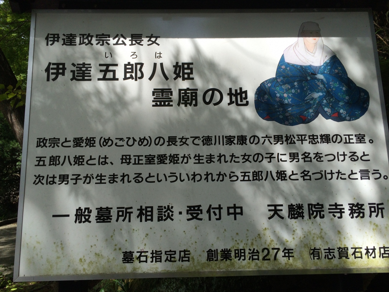 松島観光は事前に松島観光マップを入手して主だった観光地を決めたため、円通院の次に行きましたが、伊達正宗の娘の菩提寺とは知らなかったので、地図上は円通院のとなりにあるののに当分見つからずにうろうろしていると、女房がここよというのでやっと観光できました。菩提寺の塀の上に看板に正宗の長女伊達五郎八(いろは)姫と書かれていましたので気が付きませんでした。今日は墓は多く見たので、その中では普通の墓でした。