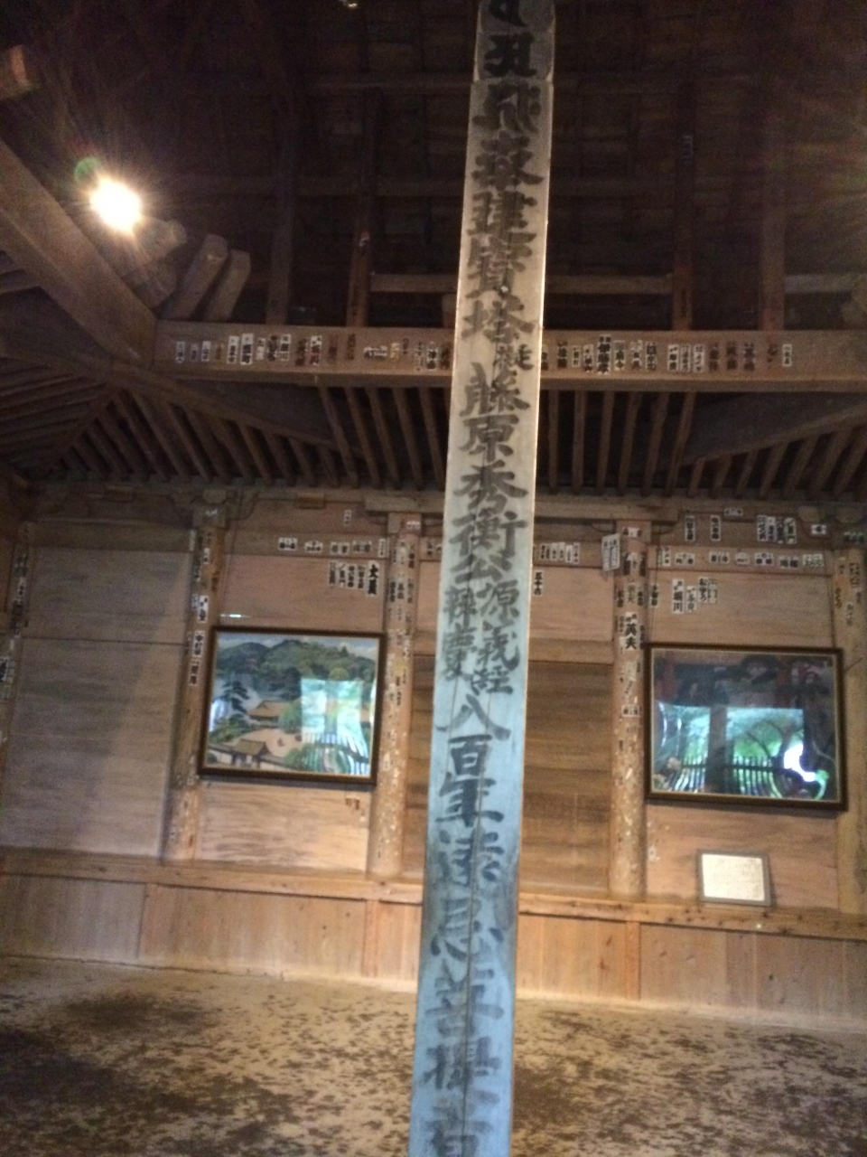 立札の説明によると正応元年(1288)の棟札により、鎌倉幕府によって金色堂の修復が行われ、五間四方の覆堂が建てられたとかんがえられてきたが、近年の調査で建立跡50年ほどで簡素な覆屋根がかけられ、増改築を経て室町時代中期に現在の形になったとみなされている。その後昭和38年に新覆堂の建築に伴いこの場所に移築された。堂の中には真ん中に柱があり藤原秀衡八百年遠忌菩堤と書いてありました。古いもので外見より内部の方が見応えがありました。