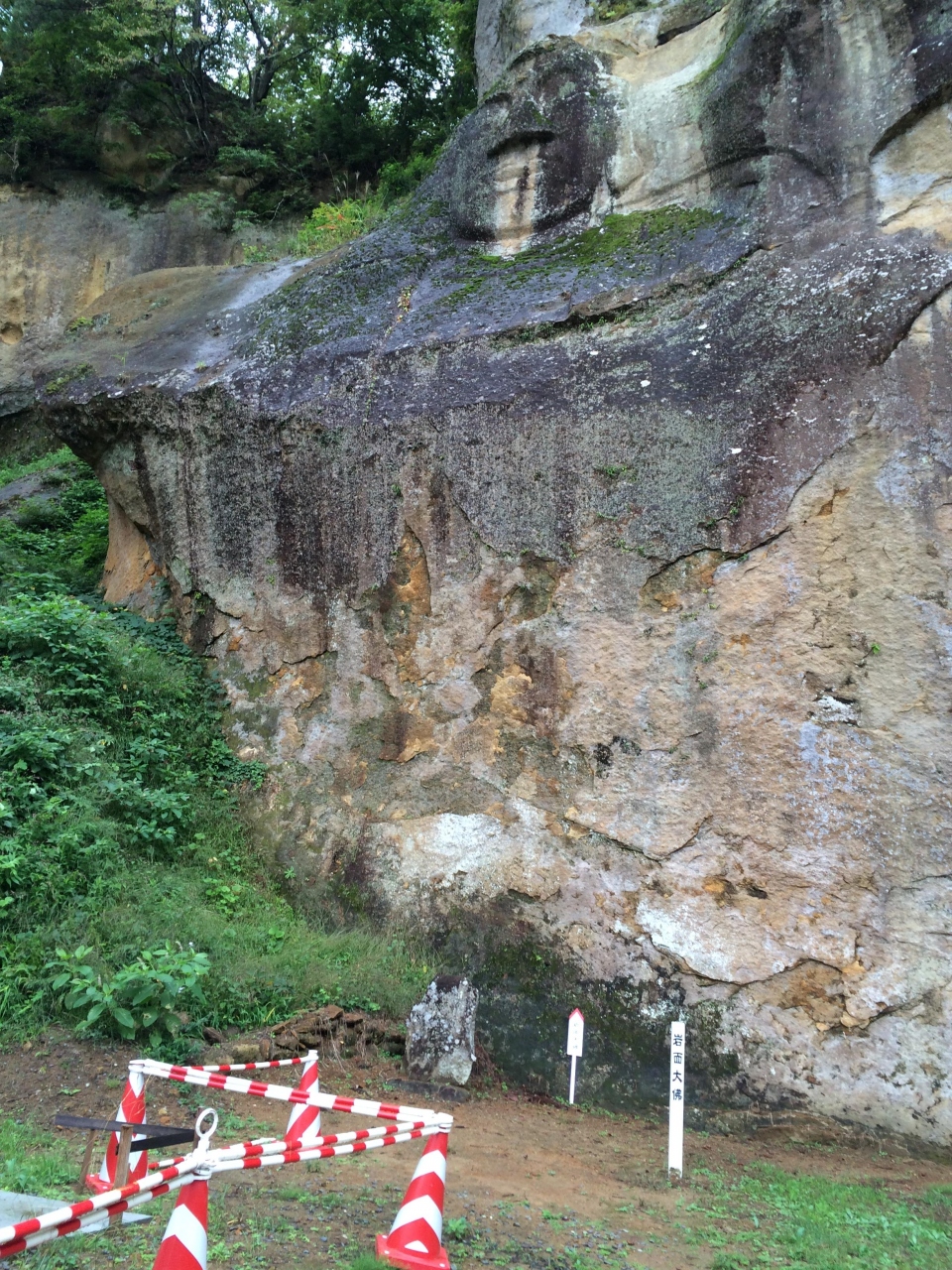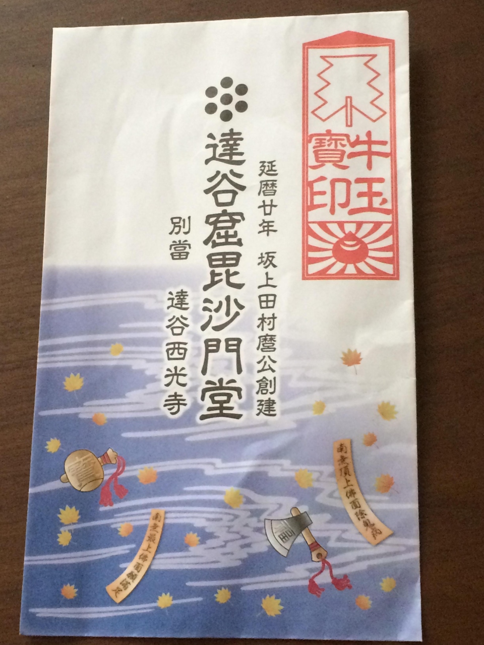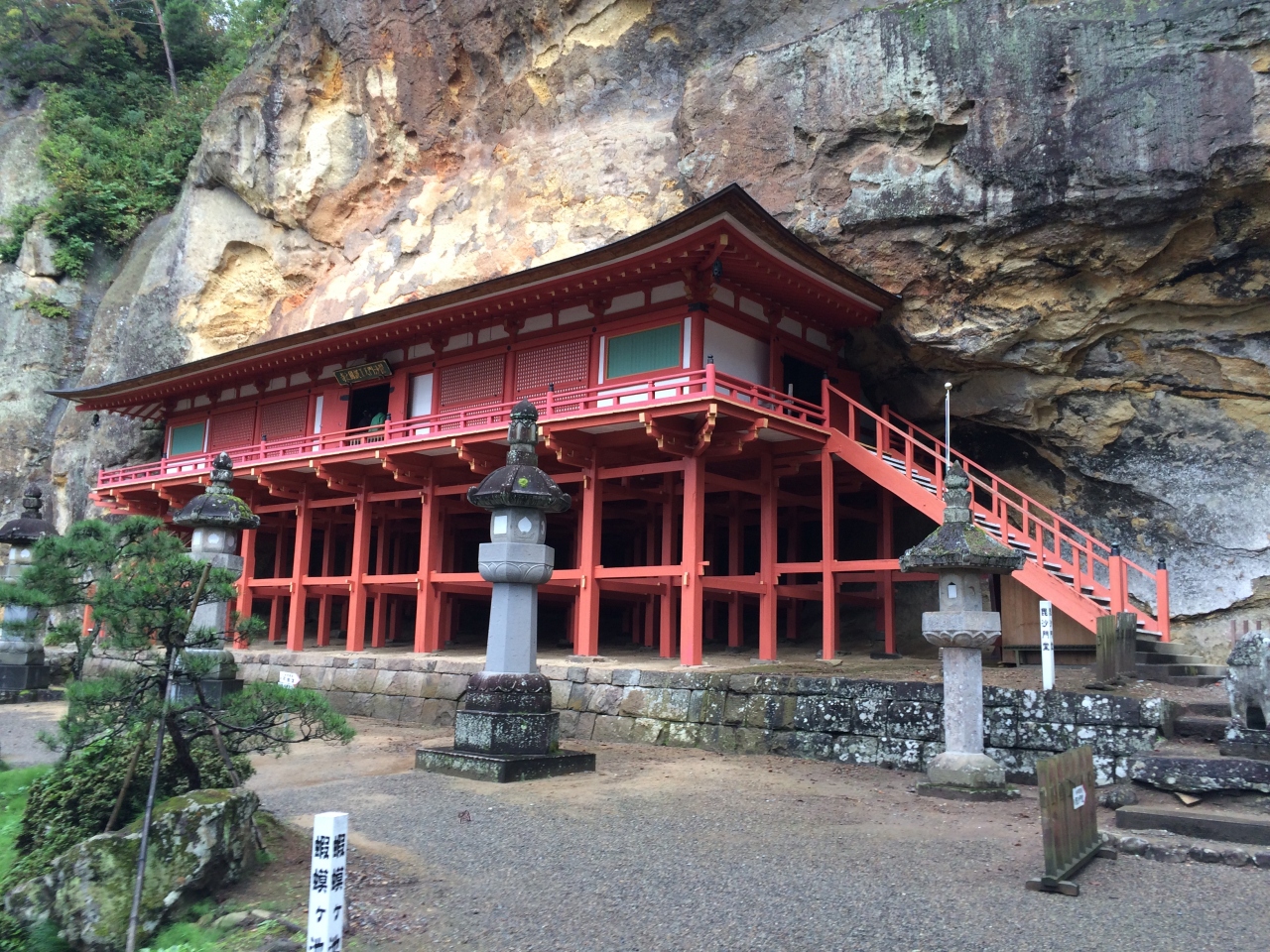 中尊寺、毛越堂と観光し達谷窟毘沙門堂に行きました。道路脇の駐車場に停め拝観料300円を払って、一之鳥居、二之鳥居、三之鳥居を潜って行くと、岸壁の下に毘沙門堂がめりこんでる様でした。鳥取の投入堂は山の上ですが岸壁に建てられている様はそっくりでした。毘沙門堂には悪鬼を降し福を招く、財宝・官位・知恵・寿命の他に縁結び・子宝・学業成就等の願いがかなうとされ、撮影禁止でした。堂内で販売されている最強のお札と言われる「牛玉寶印」を買いました。これは、修正合(元日から八日)で一日三度づつ廿一座の加持祈祷を行った独特の護符だそうで、とがった方を上にして神棚長押又は玄関に張れば悪鬼を払い福を招く等の御利益が得られると伝えられているさうです。堂を出ると岩面大佛や辨天堂(仲の良い男女は共に参らぬ事)、金堂等があり、興味惹かれるところでした。