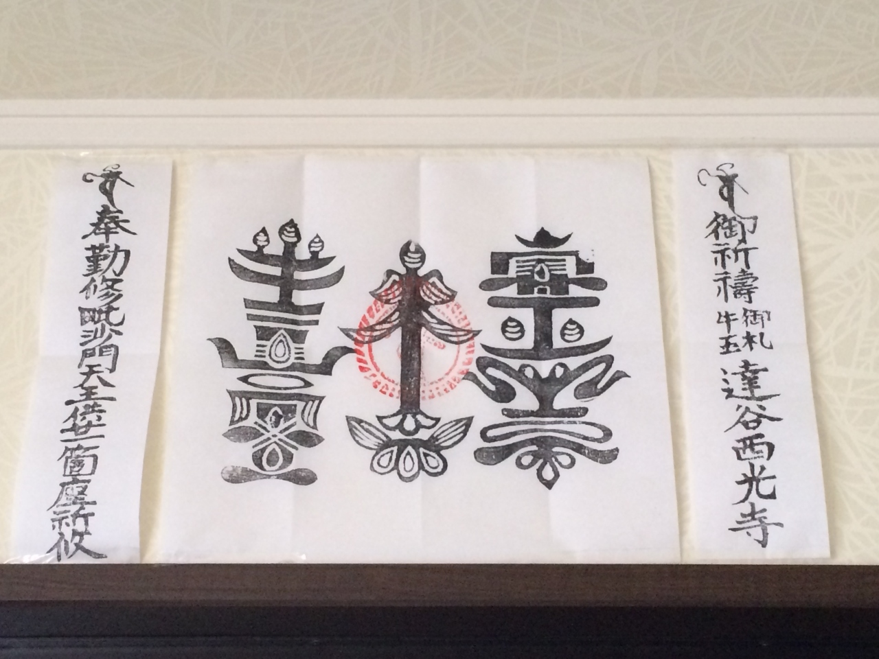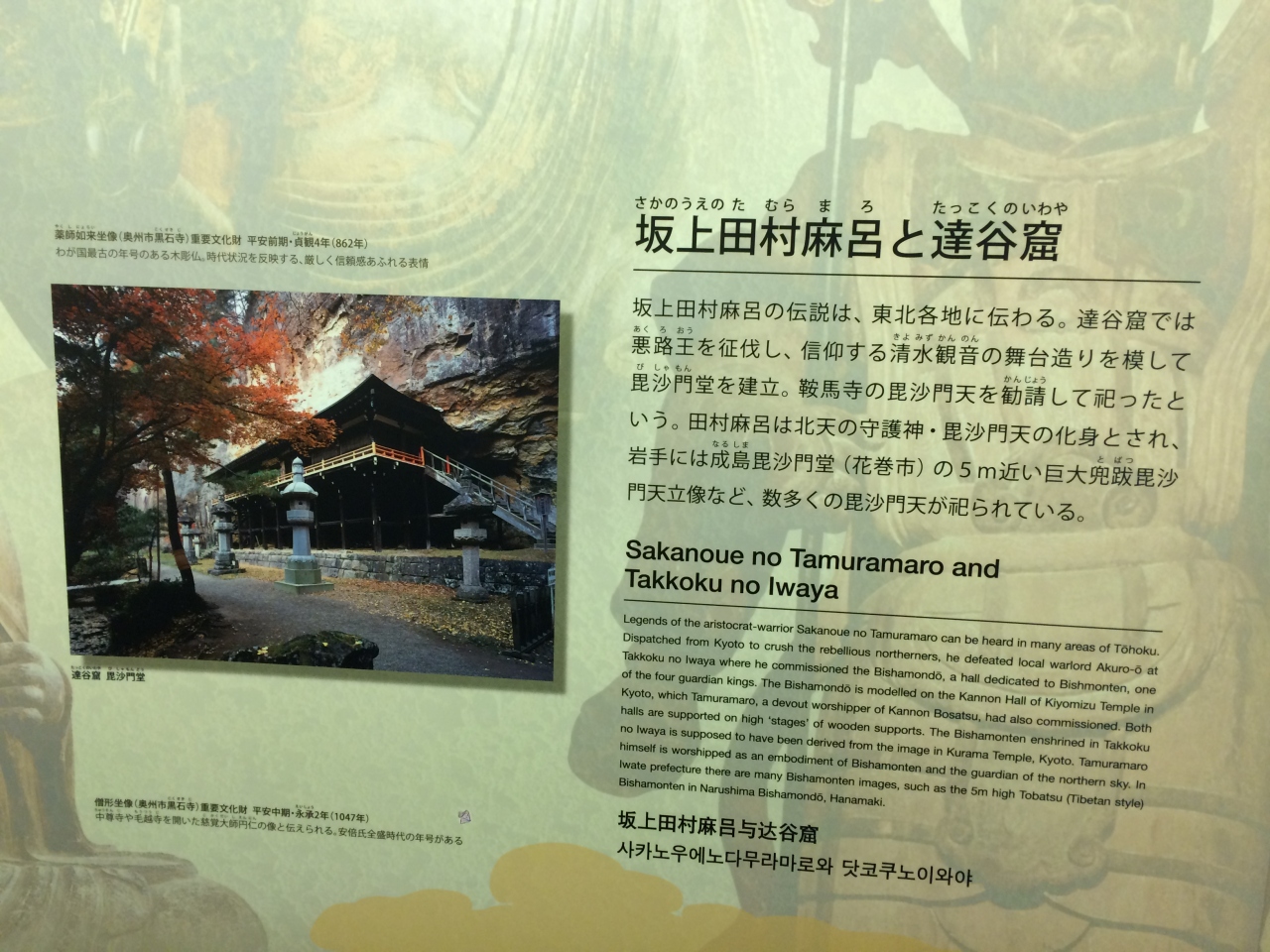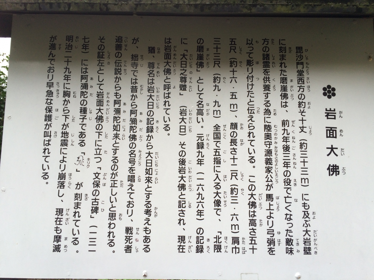 中尊寺、毛越堂と観光し達谷窟毘沙門堂に行きました。道路脇の駐車場に停め拝観料300円を払って、一之鳥居、二之鳥居、三之鳥居を潜って行くと、岸壁の下に毘沙門堂がめりこんでる様でした。鳥取の投入堂は山の上ですが岸壁に建てられている様はそっくりでした。毘沙門堂には悪鬼を降し福を招く、財宝・官位・知恵・寿命の他に縁結び・子宝・学業成就等の願いがかなうとされ、撮影禁止でした。堂内で販売されている最強のお札と言われる「牛玉寶印」を買いました。これは、修正合(元日から八日)で一日三度づつ廿一座の加持祈祷を行った独特の護符だそうで、とがった方を上にして神棚長押又は玄関に張れば悪鬼を払い福を招く等の御利益が得られると伝えられているさうです。堂を出ると岩面大佛や辨天堂(仲の良い男女は共に参らぬ事)、金堂等があり、興味惹かれるところでした。