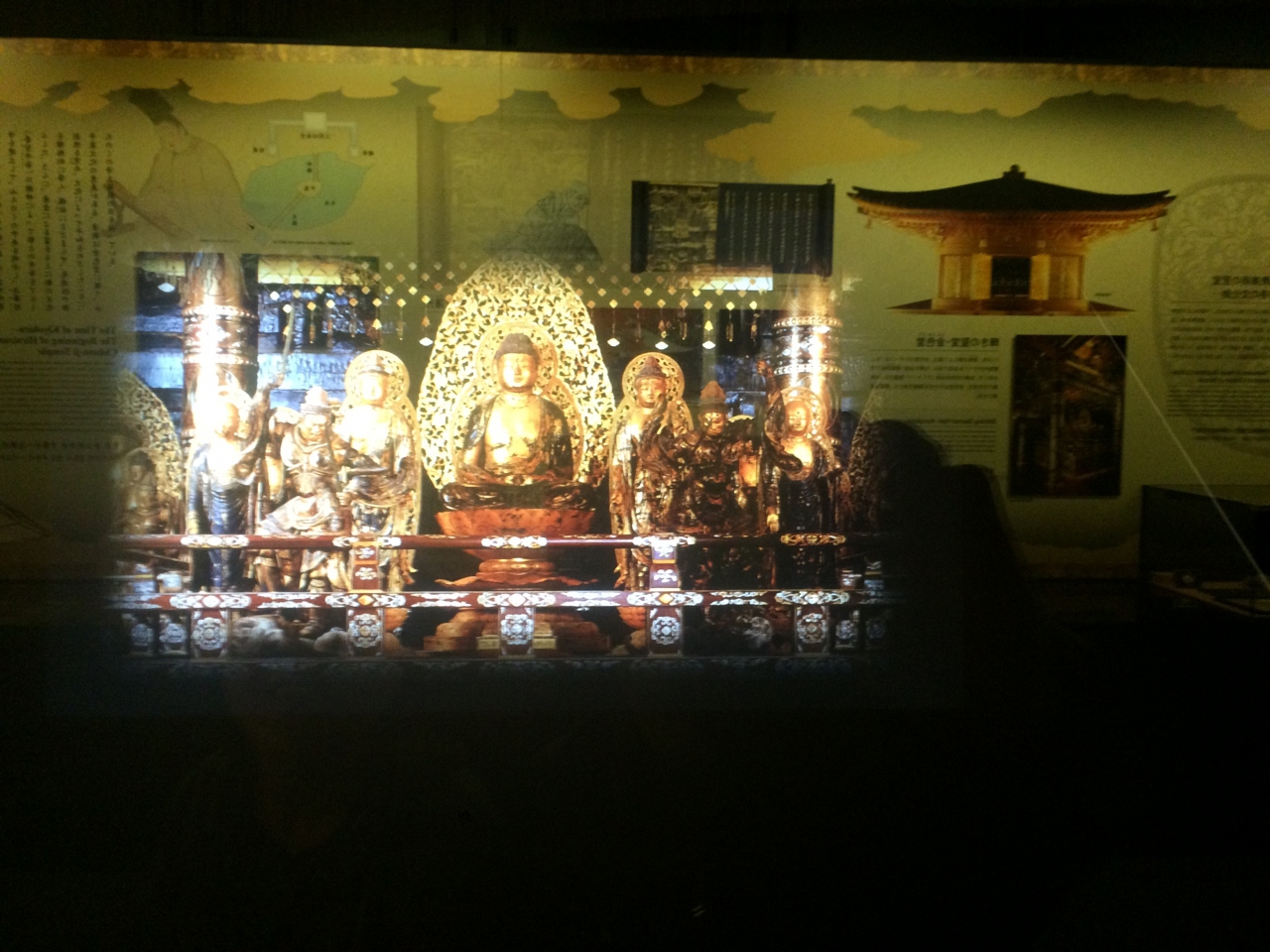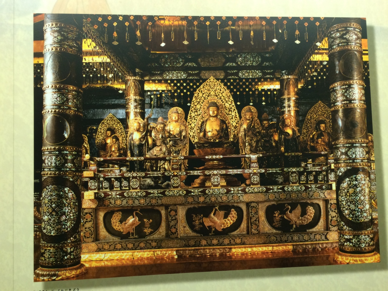 藤原氏初代の清衡夫妻により建立され、金色堂のモチーフは「光」。建物内外全てを緊迫で包み、内陣を金銀・螺鈿蒔絵で埋め尽くし、本尊阿弥陀如来(アミターバ・無量光仏)は無量の光を放ち、金色堂はその光を増幅充満させ、悪魔を退散させるそうです。それは素晴らしいの一語につきます。中央内部に清衡が眠り、左右に基衡、秀衡が安置されている。残念ななのは讃衡堂も金色堂と撮影禁止でした。中尊寺観光を済ませて平泉文化遺産センターに金色堂の写真があり撮影禁止の表示が無かったので、撮影し添付しました。