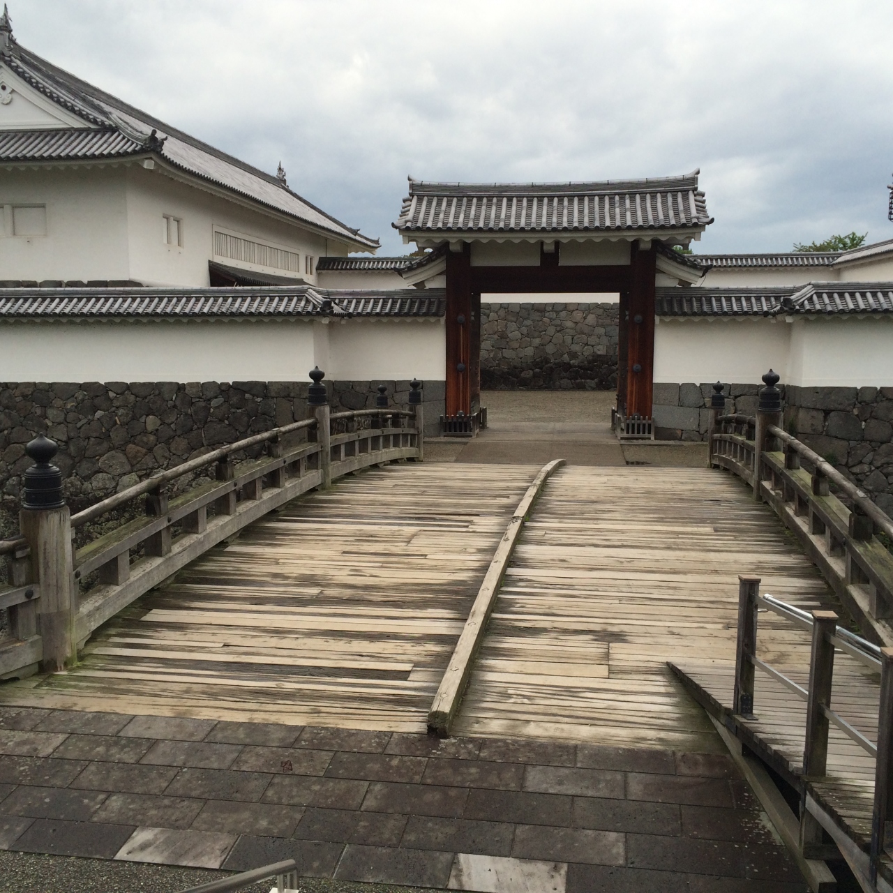 立石寺から護国神社を経由して霞城公園の北門から入り県立博物館近くの駐車場に停めました(無料)。観光客はおばさん達が数人いる程度で殆どいませんでした。二の丸大手門は多聞櫓門と高麗門で構成された枡形門で、近くには本丸一文字門石垣や県立博物館などがあります。私達が大手門に到着した時には城跡の二階の都を締めていましたので大手門を歩いて橋を渡ってみました。