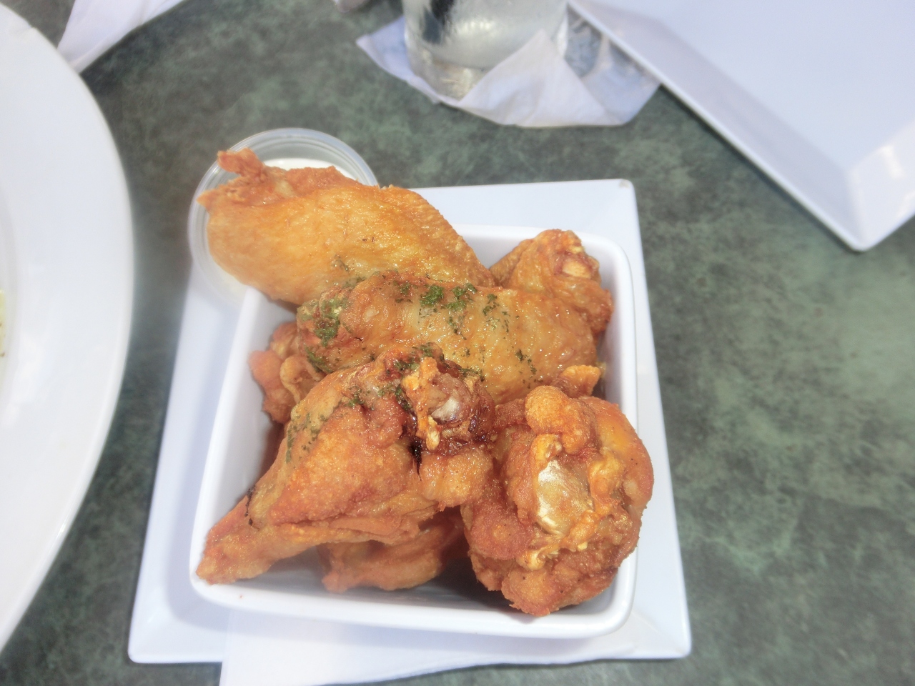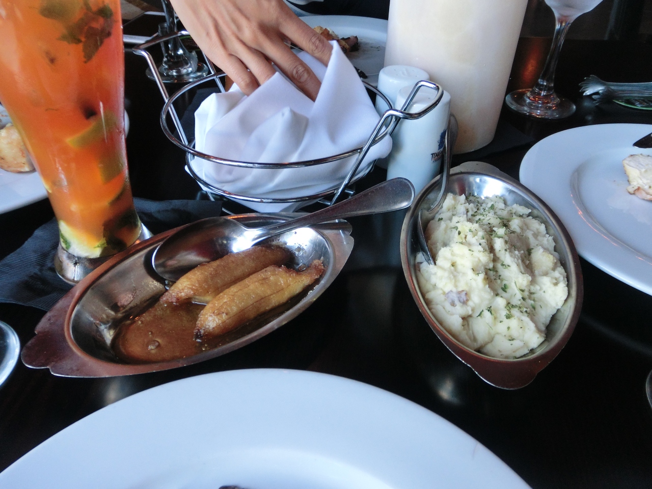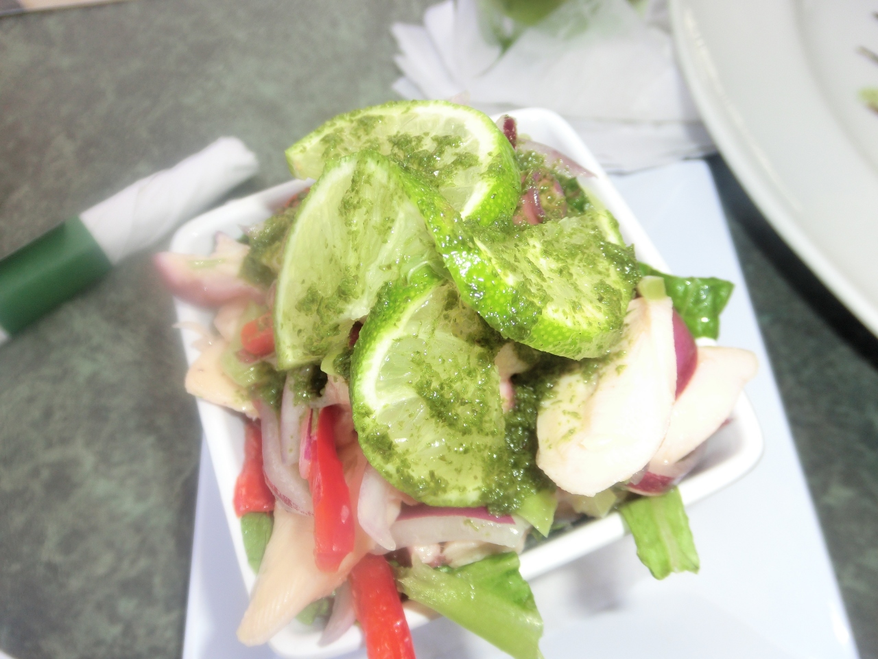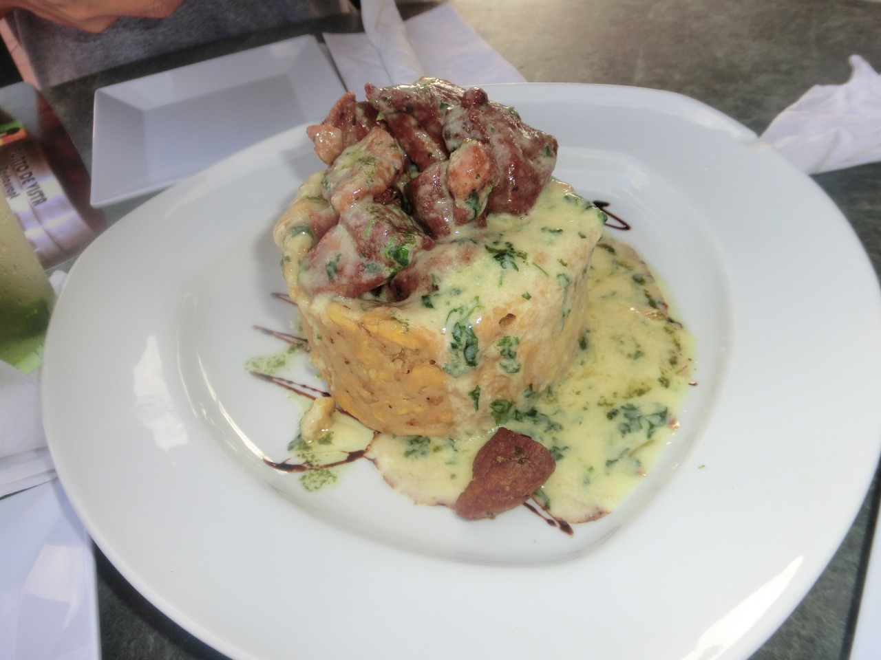 狭い路地にあるレストランで3階のベランダに案内されましたが、景色がサンファンの町と海のコントラストが綺麗でした。料理は何を頼んでよいのか解らなかったのでお勧めを注文しました。バナナ料理らしく上に肉が乗って、鶏肉料理とサラダとお酒とジュース。意外にバナナの料理が美味しかったです。3階に上がるまで宿泊所がありましたが、レストランと一緒がどうかは不明ですが店の雰囲気は良く、美味しいかどうかを聞いて来る等サービスも良かったです。