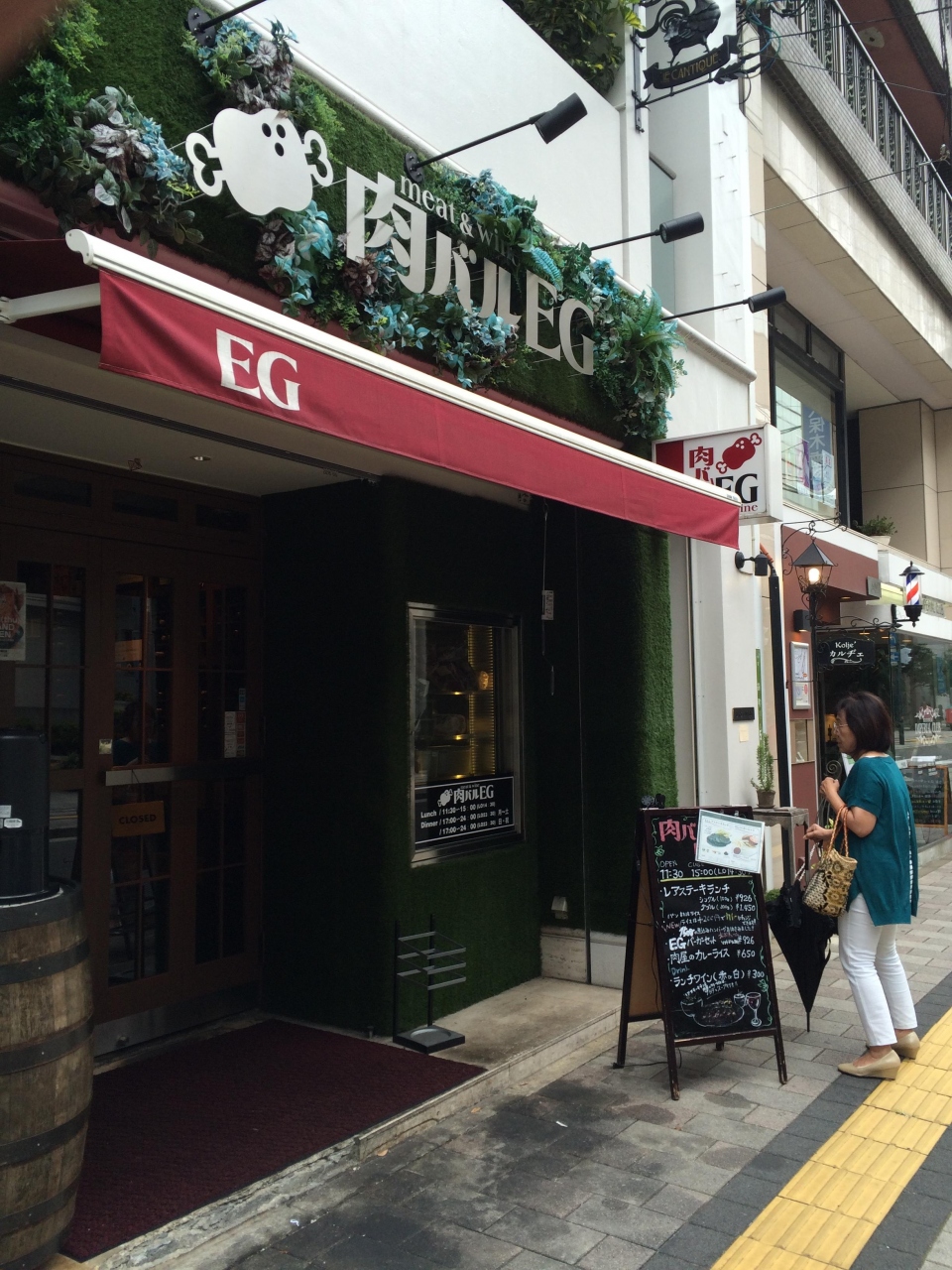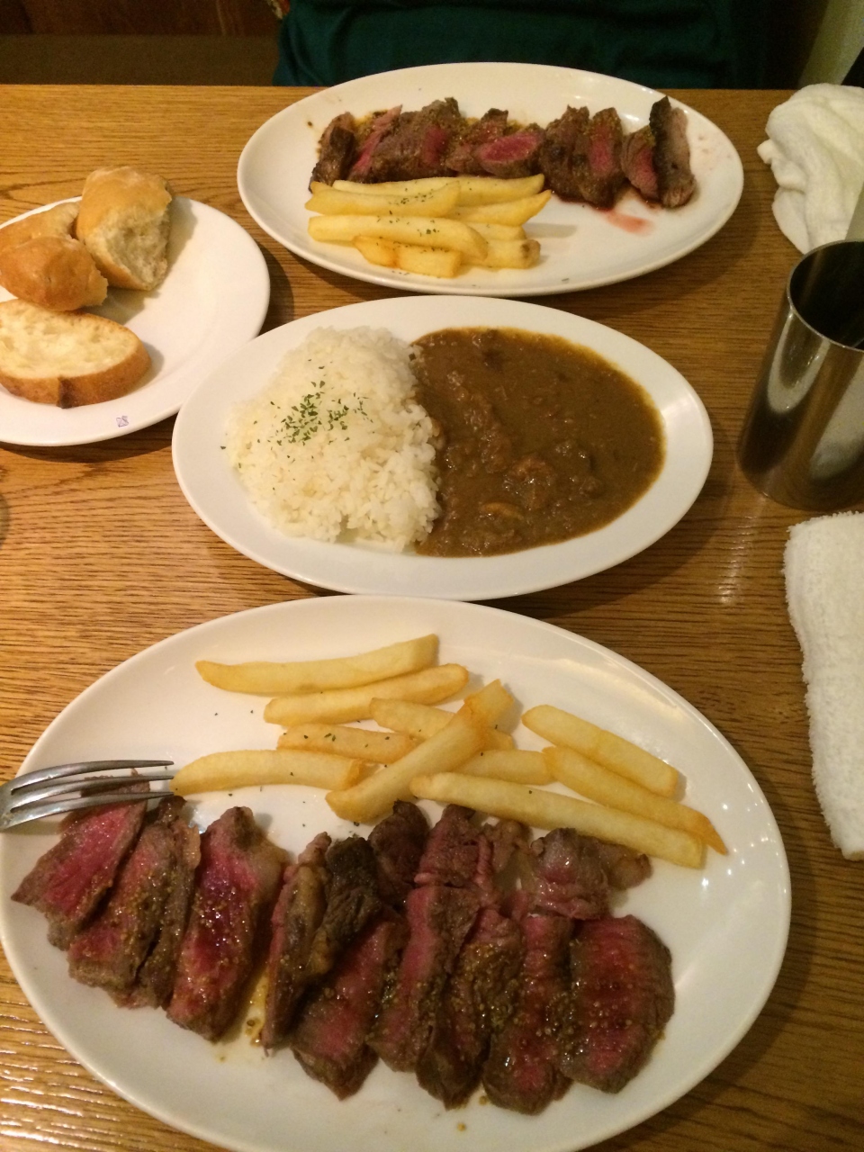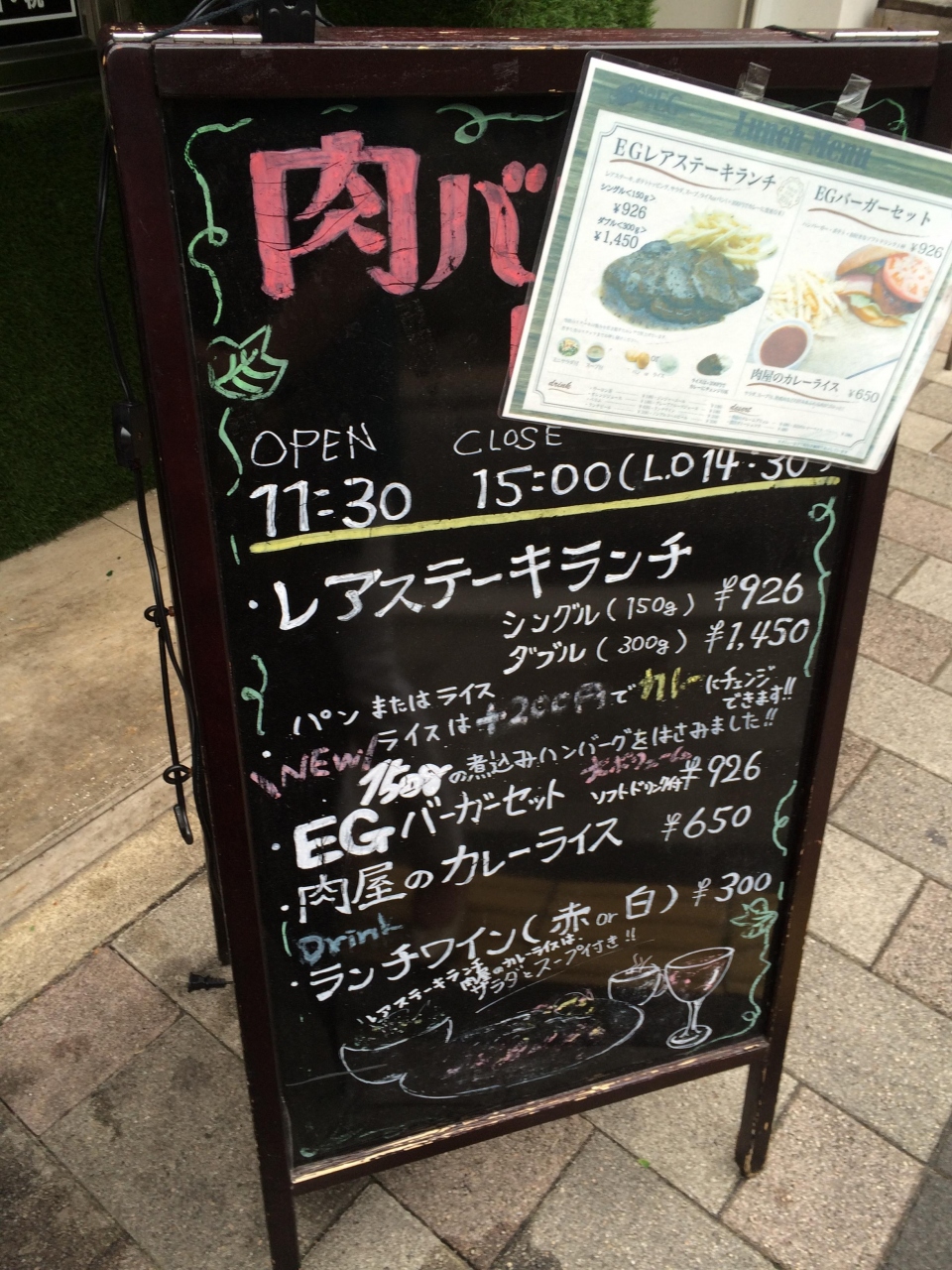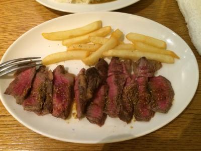 地元テレビに放映されていたレストランなので時期をずらして訪問しました。11時30分おーぶですが、食べログ等を見ると12時に行った人が満席だったらしく、日曜でもあり早めに出発して11時22分に到着すると数人が待っていました。並んでいると先客がいなくなって1番になりましたが、後ろは行列が出来ていました。11時30分入店して10分立たない内に満席となり、外には行列ができていました。ランチメニューはレアステーキランチとEGバーガーセットと肉屋のカレーライス等です。レアステーキを注文と私は200円追加してライスにカレーをかけて、妻はパンを注文。肉は今はやりの熟成肉らしく柔らかく美味しかったです。これで1000円はリーズナブルです。店内はカウンターと殆ど2人掛テーブルで隣の声が全部聞こえるくらいの距離で並んでますが、家族連れはテーブルを引っ付けて使用していました。駐車場き店の前にあるオリックス駐車場があり、20分100円でした。