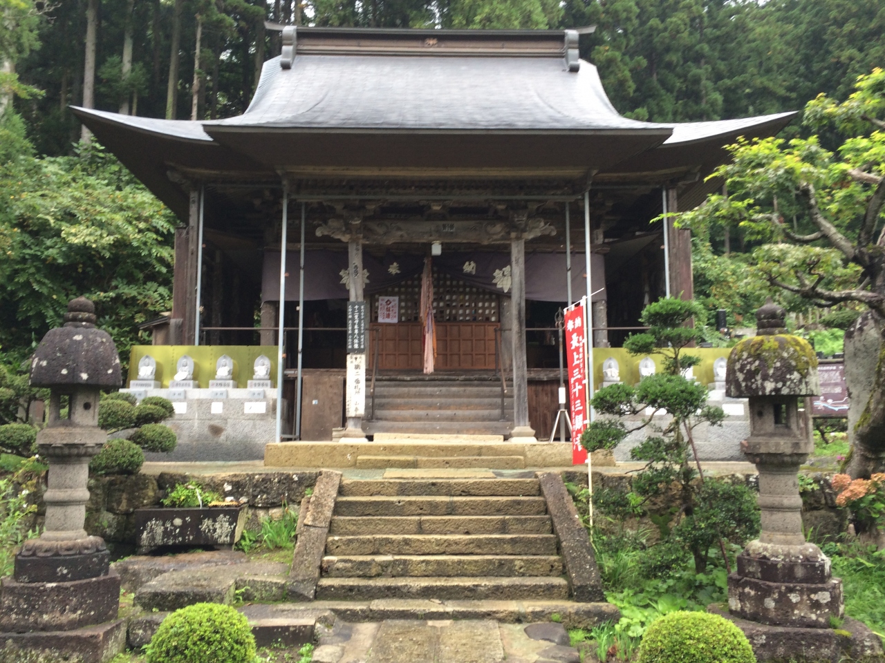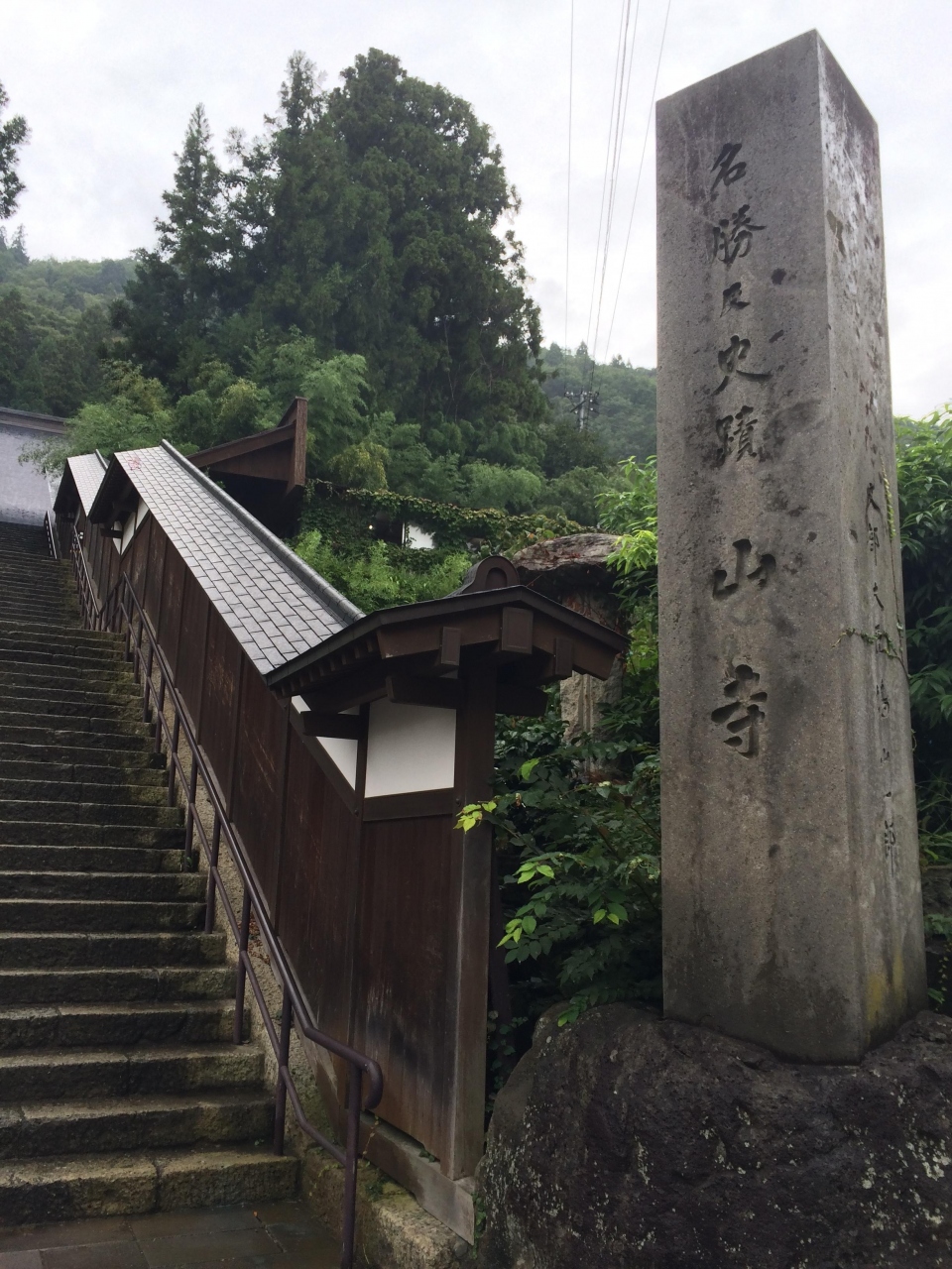 仙台市内観光の後、仙台宮城ICから山形北IC経由で約1時間強で到着。登山口入口のお土産屋さんに駐車するも、依然として雨が強く雨カッパを着用し傘もさして入り口へ向かう。名勝史跡山寺と刻まれた大きな石柱と階段を登って山寺賽珠山立石寺の入山料徴収所を通過して、1000段以上と言われる山道を登る。すぐに妻が値をあげるも妻よりお年寄りが登っているのを見て、ゆっくり歩きだしました。山寺せみ塚、仁王門、奥ノ院、五大堂と各所で休憩をとりながら1時間40分位で降りて来ることが出来ました。それにしても、雨が結構降っていたのに人の多い事、団体客も外人さんも多かったですが、韓国語と中国語を聞くことがなかったのが幸いでした。