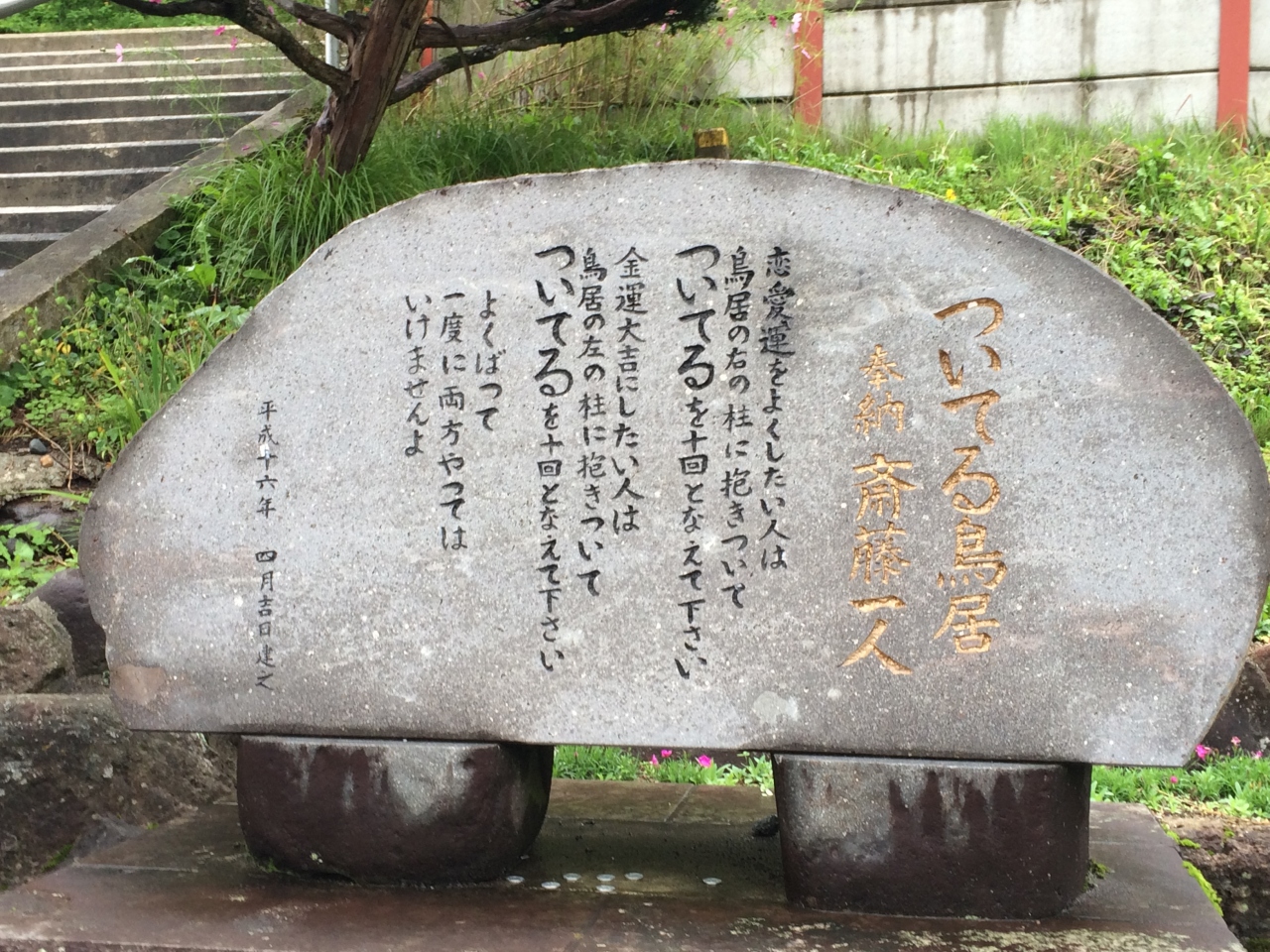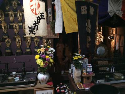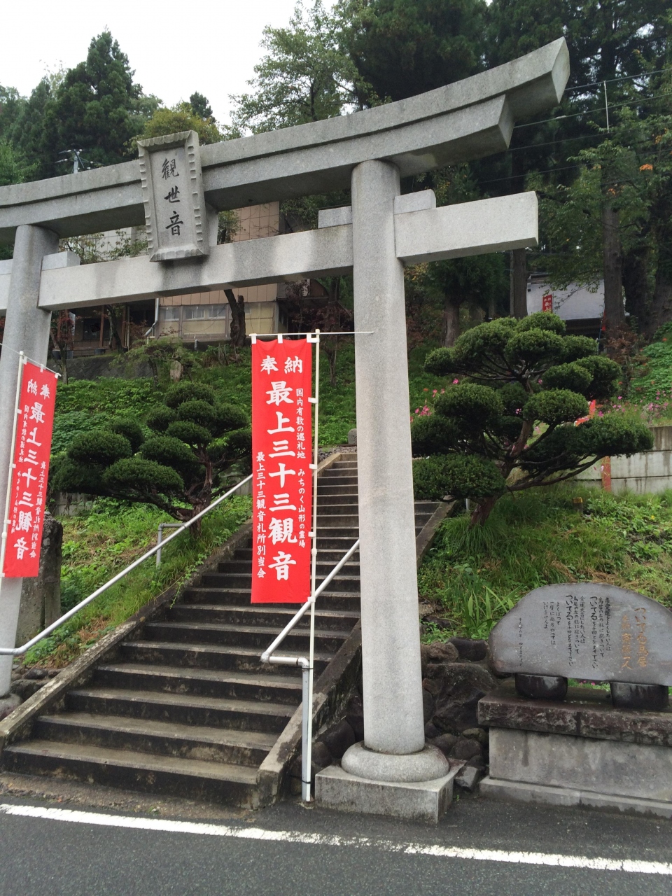 山寺の帰りにお土産やに聞いて千手院(最上三十三観音二番札所)に行ってきました。山寺から1キロ位奥にありますが、山寺は沢山の人がいたのに全く人はいませんでしたし、駐車場も道路脇に停めました。鳥居があるのですが、鳥居を登ると線路があり踏切のない線路を渡って階段を登ると神社があります。階段の途中に2人の人が居て話をしていると、殆ど人は来ないそうです。珍しいのか本堂の中を見せてくれたので参拝しました。帰りには鳥居の石碑を読んで帰れと言うので行ってみると、その脇に石碑があり、ついてる鳥居と書いてあり、恋愛運をよくしたい人は鳥居の右の柱に抱き着いて「ついてる」を10回となえて下さい。金運大吉にしたい人は、鳥居の左の柱に抱き着いて「ついてる」を10回となえて下さい。また、欲張って一度に両方やってはいけませんよ、と刻んであるので金運の柱に抱き着きました。非常にユニークで面白かったです。