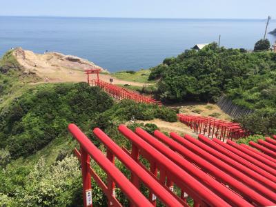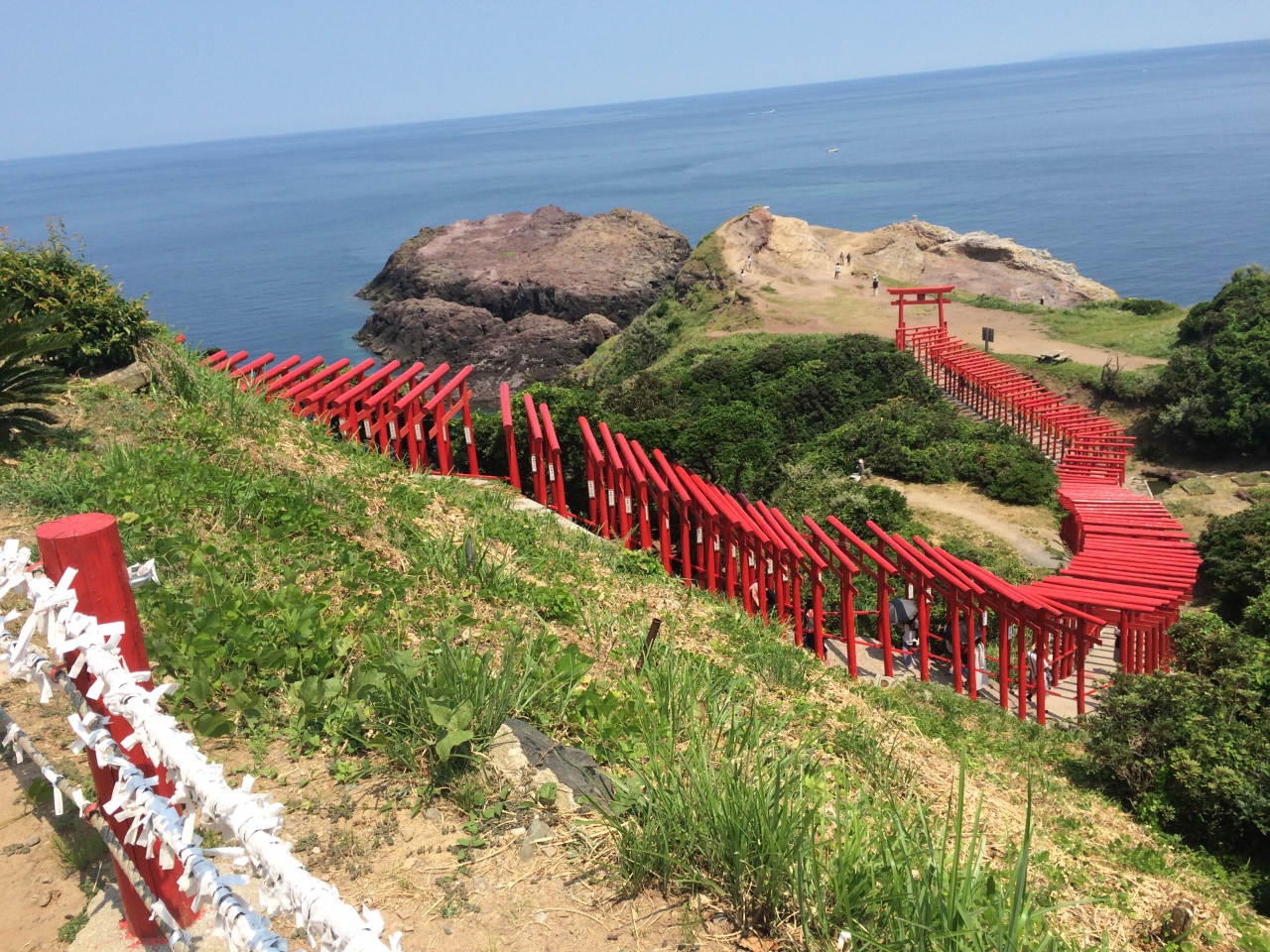 アメリカのCNNがウエブ上で「日本の最も美しい場所31選」に選ばれてから、観光客が急増した場所です。テレビで紹介されたのを見て女房が行きたいと言っていたので言ってきました。廿日市ICから高速、一般道で4時間弱かかりました。カーナビで行かれる方は龍宮の潮吹きで入力して下さい。到着するまでの3kは道が狭く離合できにくい場所もあるので一方通行になっているので注意して下さい。詳しくは「ながと観光ななび」を参照。我見上から崖下まで鳥居があり、景色と共に圧巻でした。大鳥居から崖下に降りる左手に神社がありお参りとおみくじ、お守りが購入できます。金額が書いてありますのでお金を入れて下さい。おつりは出ませんので小銭を用意して下さい。入口の大鳥居上に元ノ隅稲成大神と書いてある裏に賽銭箱があり、賽銭を投げ入れる事が出来れば願いが叶うそうで、皆さん何回もチャレンジされていました。