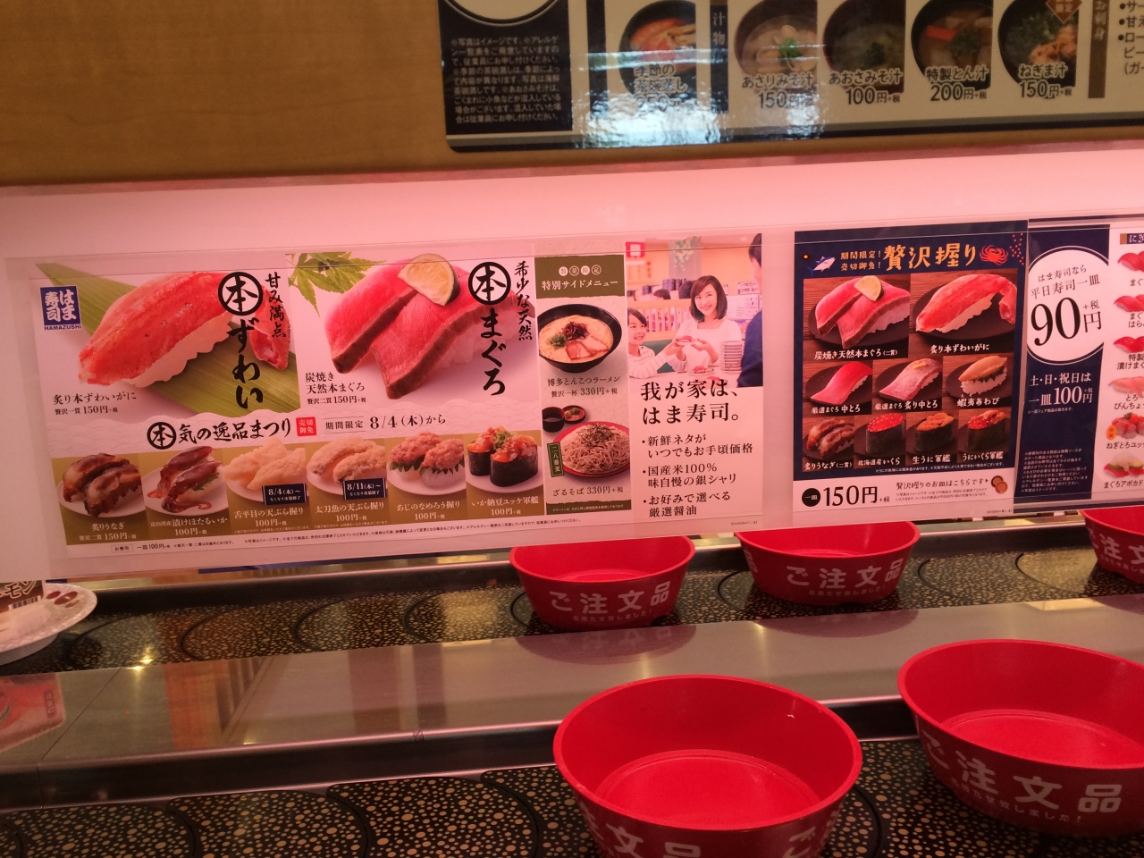 夏休み中の孫が暇だというので食事に連れて行くことにした。今年1年生になった孫には良くランチをセガマレ再々食事にいきますが、今日は何処に食べに行きたいか聞くと即答ではま寿司と答えた。そういえば今年に入って新規開店したとは聞いていたが、私は食べに行ったことが無かったので行って見た。1時過ぎに行きましたが駐車場はほぼ満杯、店内に入って順番を待ちましたが、回転が速いのか長くは待ちませんでした。ボックス席に着くと孫が注文の仕方やワサビの取り方などを教えてもらって注文。孫は自分で機会を使って注文しました。何回か来た事がある様で詳しく、それが災いしてデザートや果物を沢山注文した様で100円寿司にしては高くつきました。乳房によるとスシローよりは美味しいと言ってました。確かにデザート等の種類は豊富で子供向けかもしれませんが、シャリは良かったです。でも、1つ1つが小ぶりなので、気が付いたら多く食べる結果になっていました。