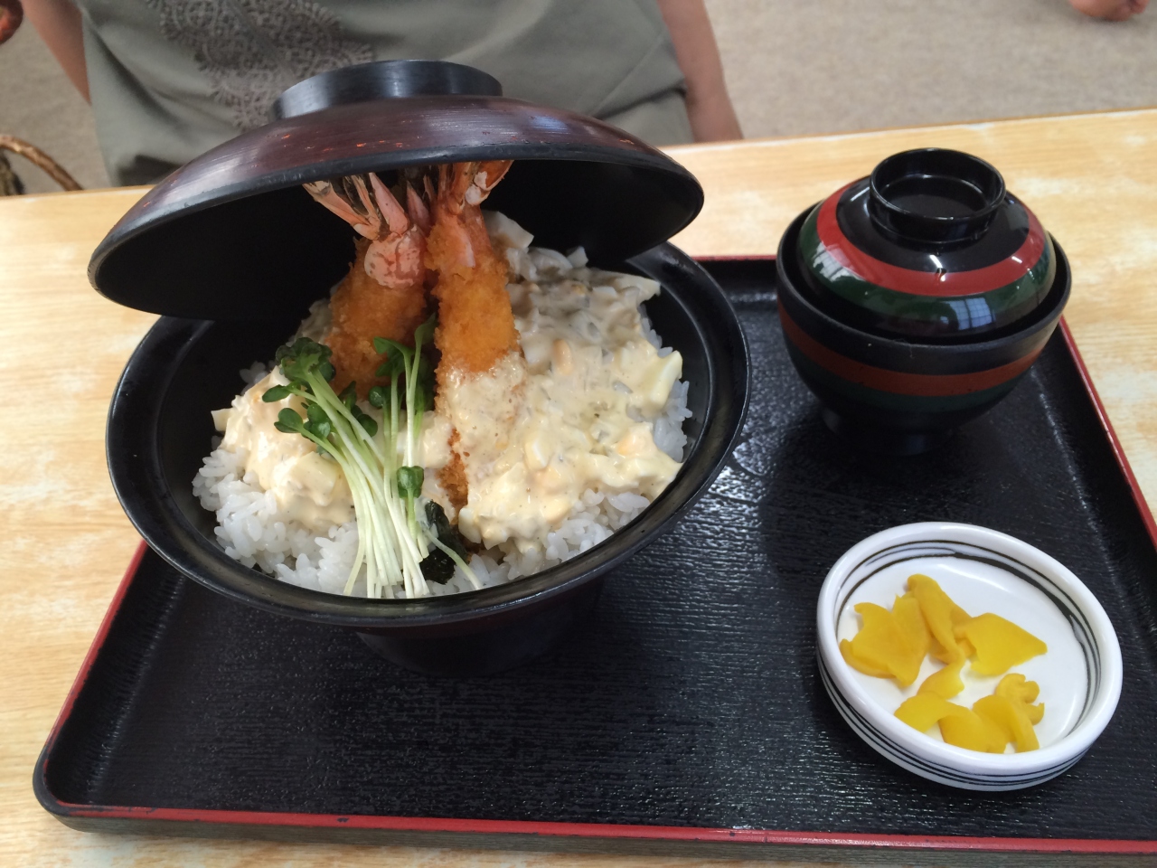 吉備津神社を観光したら昼過ぎだったので、事前に食べに行きたい梶屋へ行く事にしました。ナビによると45分かかるそうですが、時間もあるので行きましたが遠かったです。到着すると1時50分でしたが駐車場は満杯。すこし待って駐車場に入れましたが6~7人並んでたので名前を書くのだろうと思って店内に入ると名前は書かずに並ぶのだそうです。その間に並ぶ人数が増えていてロスしました。20分くらい待って店内に呼ばれると先客が1組座っていました。すくに座敷に案内さりました。店内はカウンター5席、4人掛テーブル5、座敷2となっていました。食べるものは事前に決めていてカッチャー飯にエビ丼を注文。ブログにあった通り、量が多いです、特にカッチャー飯は食べきれませんでした。ブログにはなかった持ち帰りが出来ますとメニューに書いてあるのも頷けました。エビ丼850円、カッチャー飯980円はリーズナブルです。他の人の注文はエビ丼も多かったです。