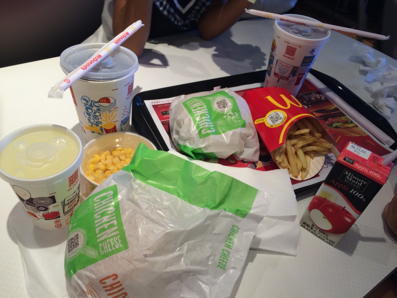 娘から孫がマックのポテトを食べたいと言っていると電話があったので、もう一人の孫と広島ゆめタウン迄出掛けました。1Fのマックに入店すると13時過ぎているにも係らず長蛇の列で、注文するまでポテトと言ってました。6歳の孫はハッピーセットなるものを注文2歳の孫はポテトとリンゴジュースとハンバーグを注文。注文後は孫達と別行動で、私達夫婦は食堂街に行く予定でしたが、孫達が一緒にいると言うのでハンバーグとコーラを注文しました。マックは異物混入があってから一度も訪問した事がなく、今日が初めてです。でもレストランとそんなに金額差があるでも無く、孫達と一緒でなければ来ることはないと思います。