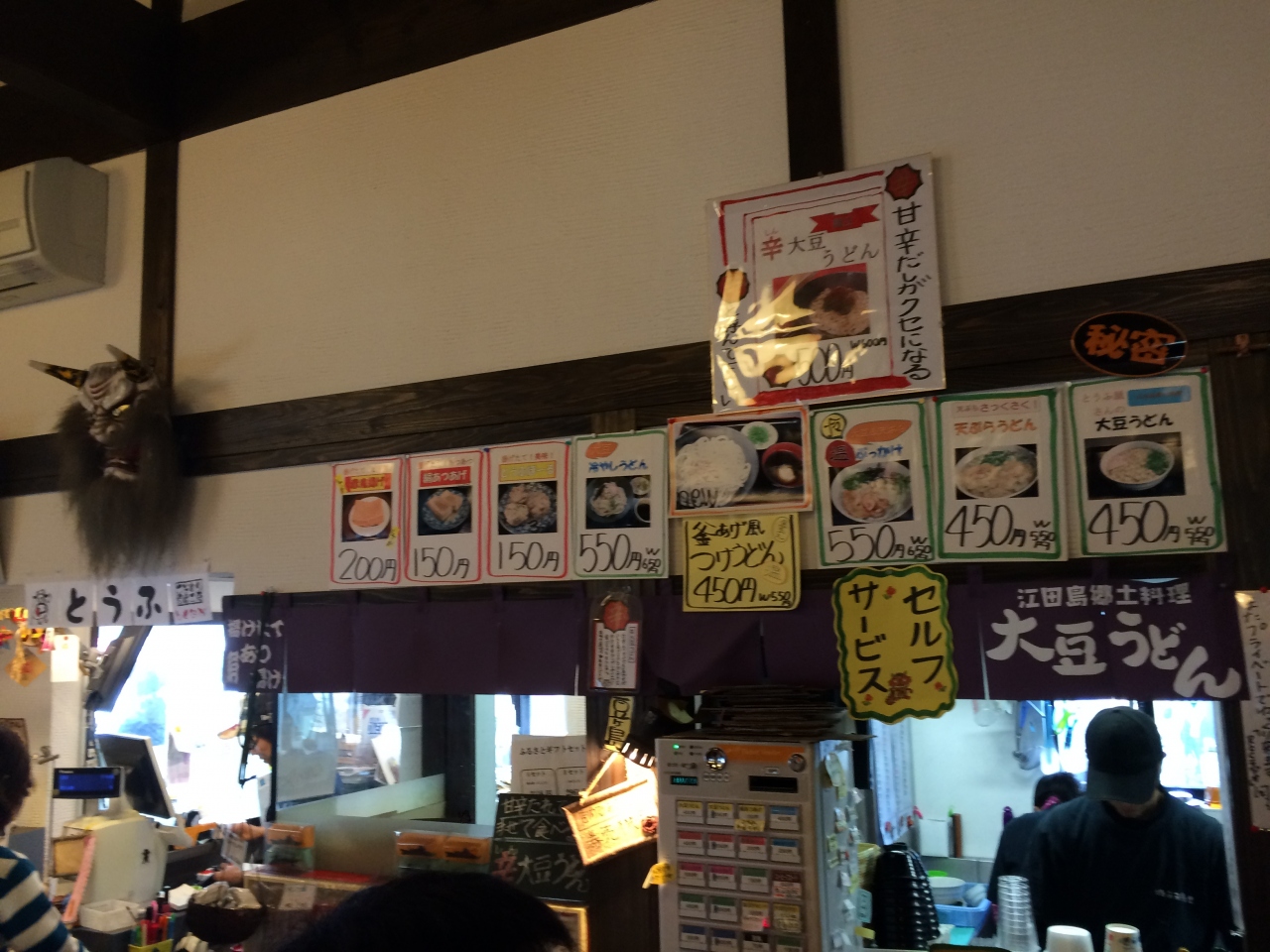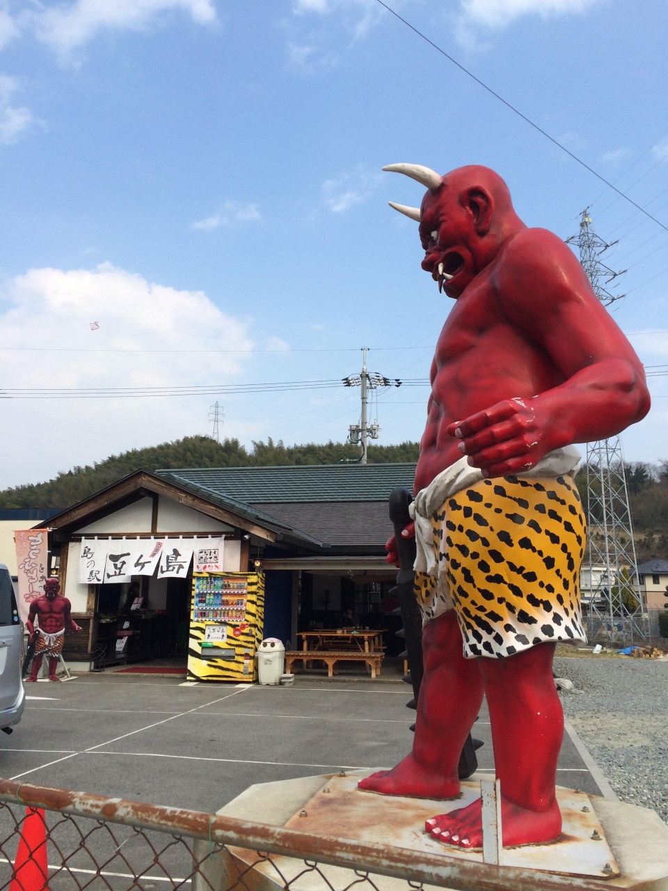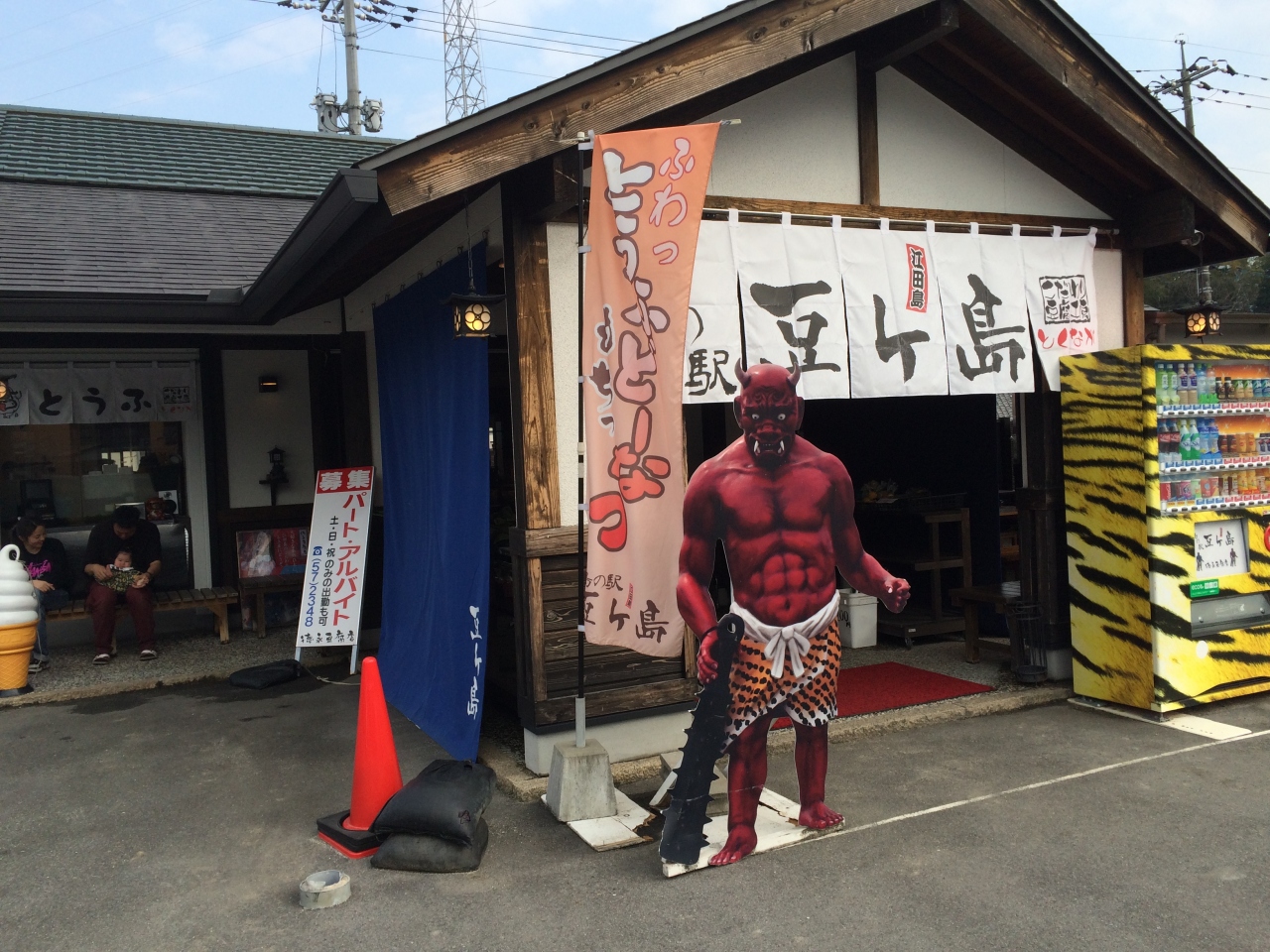 能美島で食事をした帰りに44号線を走行していると大きな鬼を発見、通り過ぎたため娘がUターンしてと言うので入ってみた。既に何組かが写真撮影をしていました。早速孫二人を写そうとすると2歳の孫から拒否されました。店舗入り口には鬼の看板があり豆腐屋さんですがうどんもあり、豆腐は辛い豆腐や豆腐のレアチーズとか変わった豆腐が沢山ありました。また道の駅を模倣したのが鬼の看板から入口迄に野菜が販売されていました。