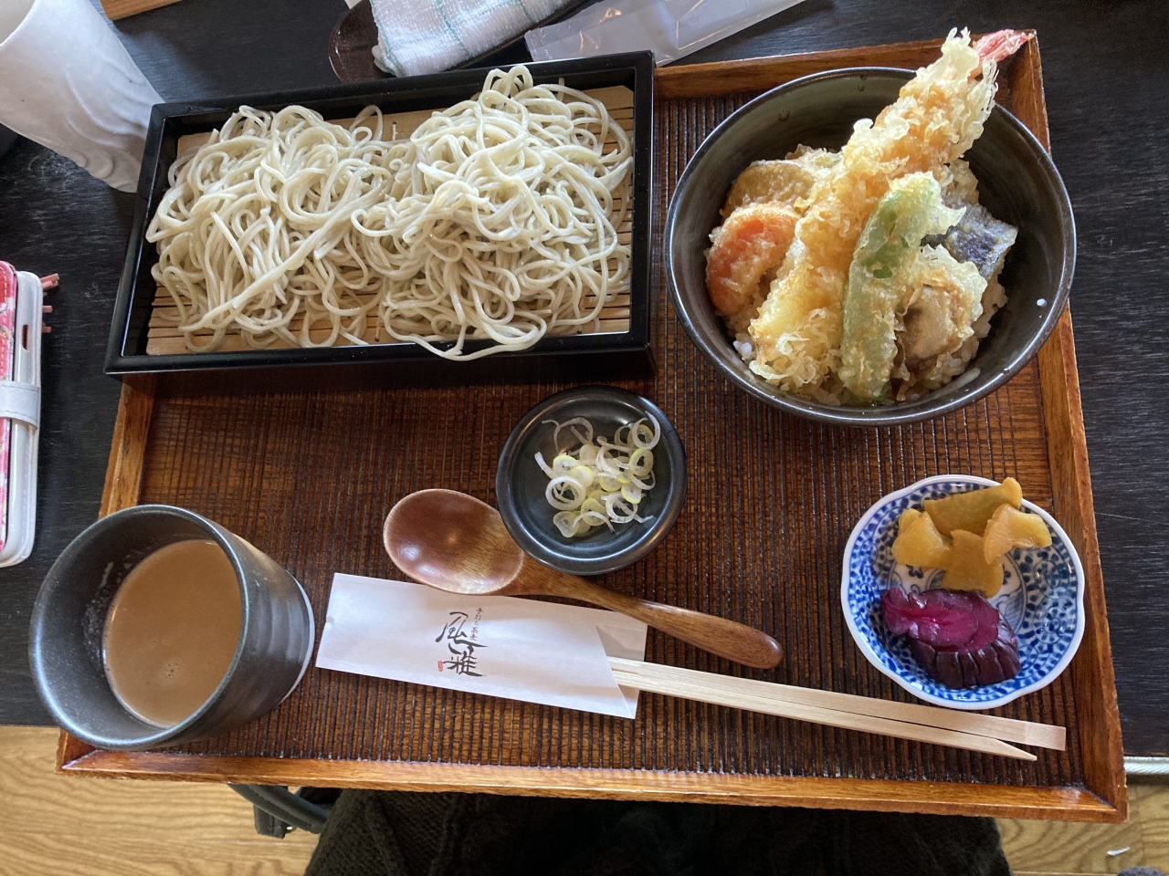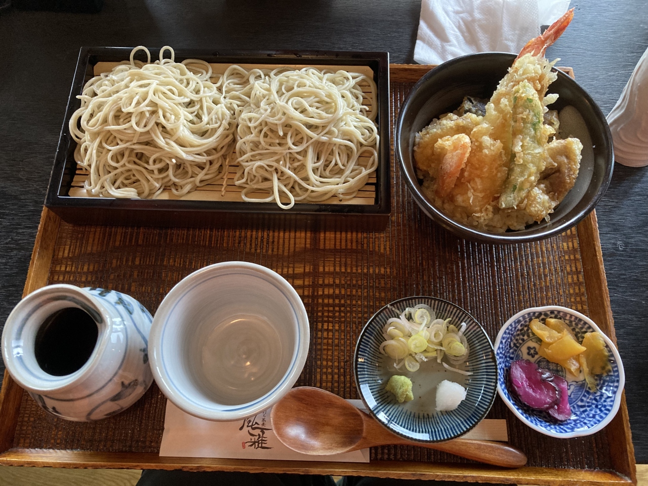 人気店らしく蕎麦が無くなり次第終了との事で営業前の11時5分に到着しましたが、既に先客が1組駐車場で待機していました。開店までに4つある駐車場は埋まり、第二駐車場に行かれた車も数台いました。古民家と言うより表札のある民間なので多数が入れるスペースはなく、帰るときも数組待機されていました。私達は庭が見える二人かけテーブルで、平日ランチセット「蕎麦わ選択後にご飯・丼とデザートをトッピングする」の中から「せいろ蕎麦と胡麻だれせいろ蕎麦とミニ天丼にデザート」を注文。初めに蕎麦1本食べると蕎麦の香りと味も良く美味しかったです。良い蕎麦屋を紹介してくれた友達に感謝!