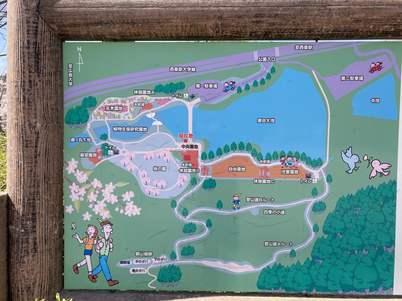 公園内には駐車場第一(60台)、第二(160台)と休憩所、花木園地、植物生体研究園地、展望台、桜園、児童園地、休憩園地等があり広大な敷地でした。