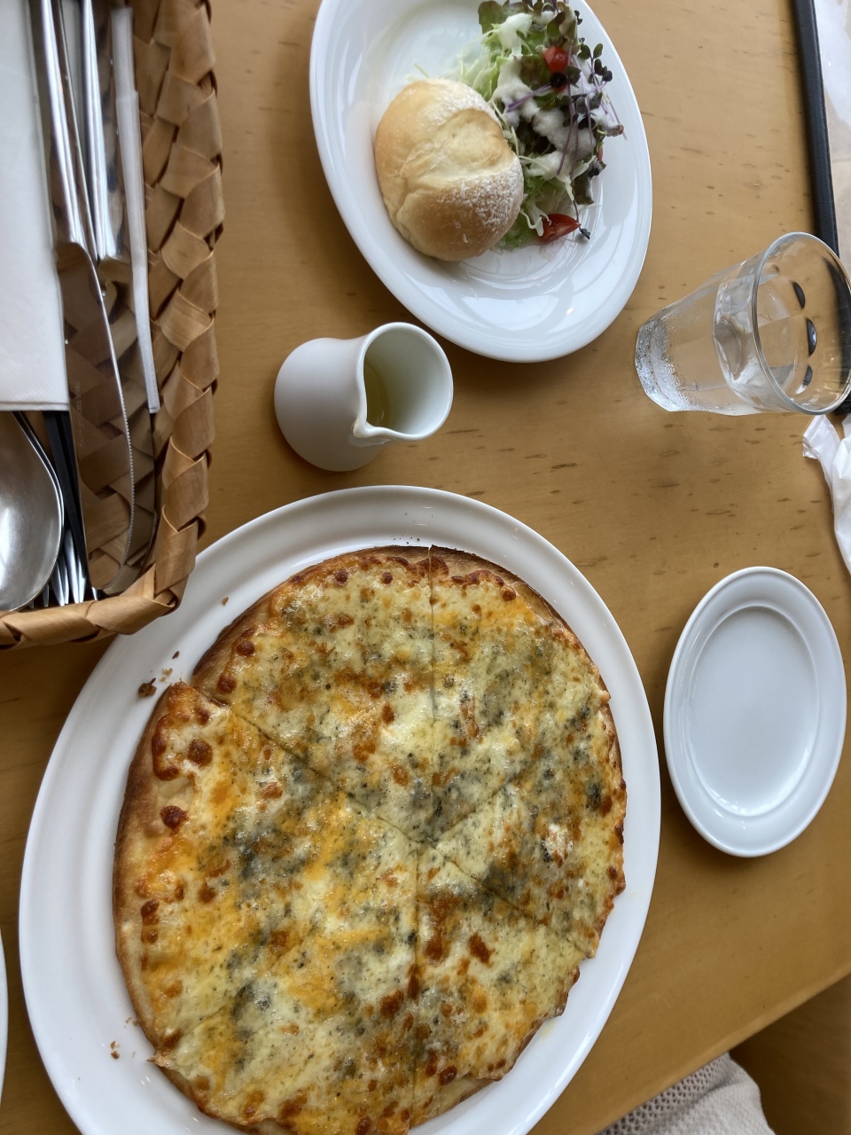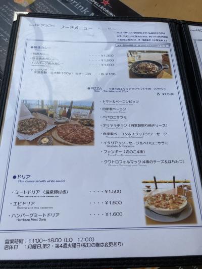店内は海に面した壁が全てガラスで開放的かつ瀬戸内の海が良く見えリラックスできました。メニューはカレー(焼きカレー、野菜焼きカレー、ハンバーグ焼きレー)とPIZZAとドリアがあり、デザートとドリンクがあり、自家製ベーコン%イタリアンソーセージとクワトロフォルまっじ4種のチーズ&はちみつと、デザートはシフォンケーキサンドを注文。