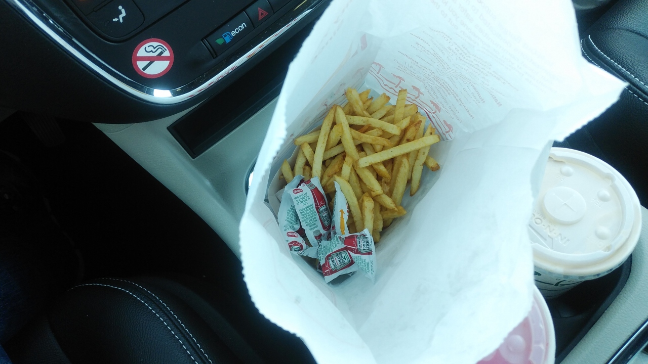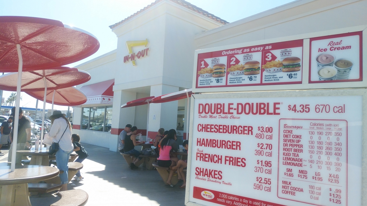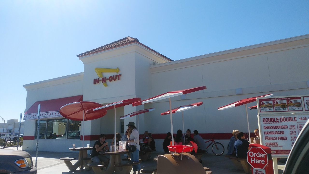 カリフォルニアのキンプトンにあるビーチのホテルに2泊してサーフィンをした後に、西海岸で1番美味しいハンバーグと聞いたので行ってみました。まず店内は満員なのでドライブスルーに並びましたが多かったです。店員が外で並んでいる車から順番に注文を聞き無線で連絡して、料金を払う窓口を通り、別の窓口で注文したものを受け取るシステムでした。