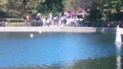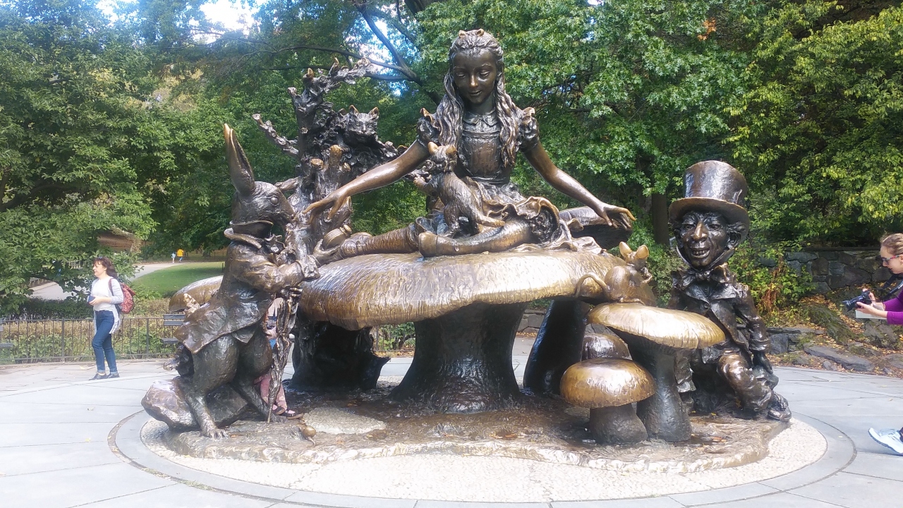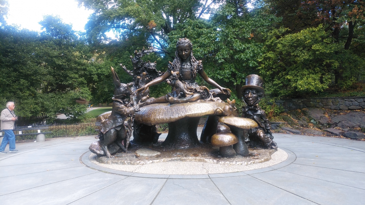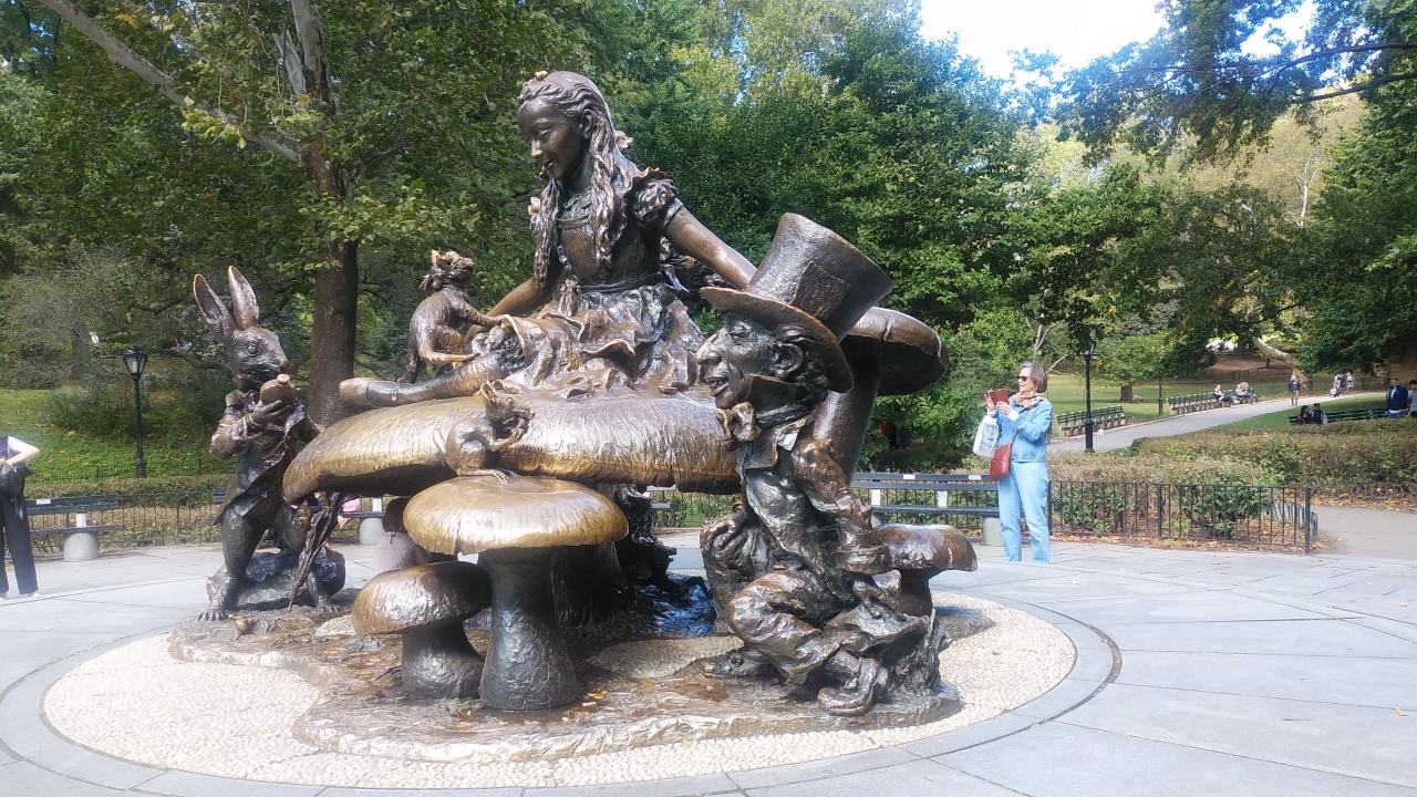 conservatory water横のアッパーウエストサイド72丁目から入り、ベセスタの噴水を見て行きましたが、カップルや子供に人気の像で、大きなマッシュルームの上に座ったり、アリス像の両サイドにある兎のキャラクターな子供やカップルが遊んだり、写真を撮っていて順番待ちの状態でした。周辺にはかなりの人が散策等自由に楽しんでいて、時間がかかりました。
