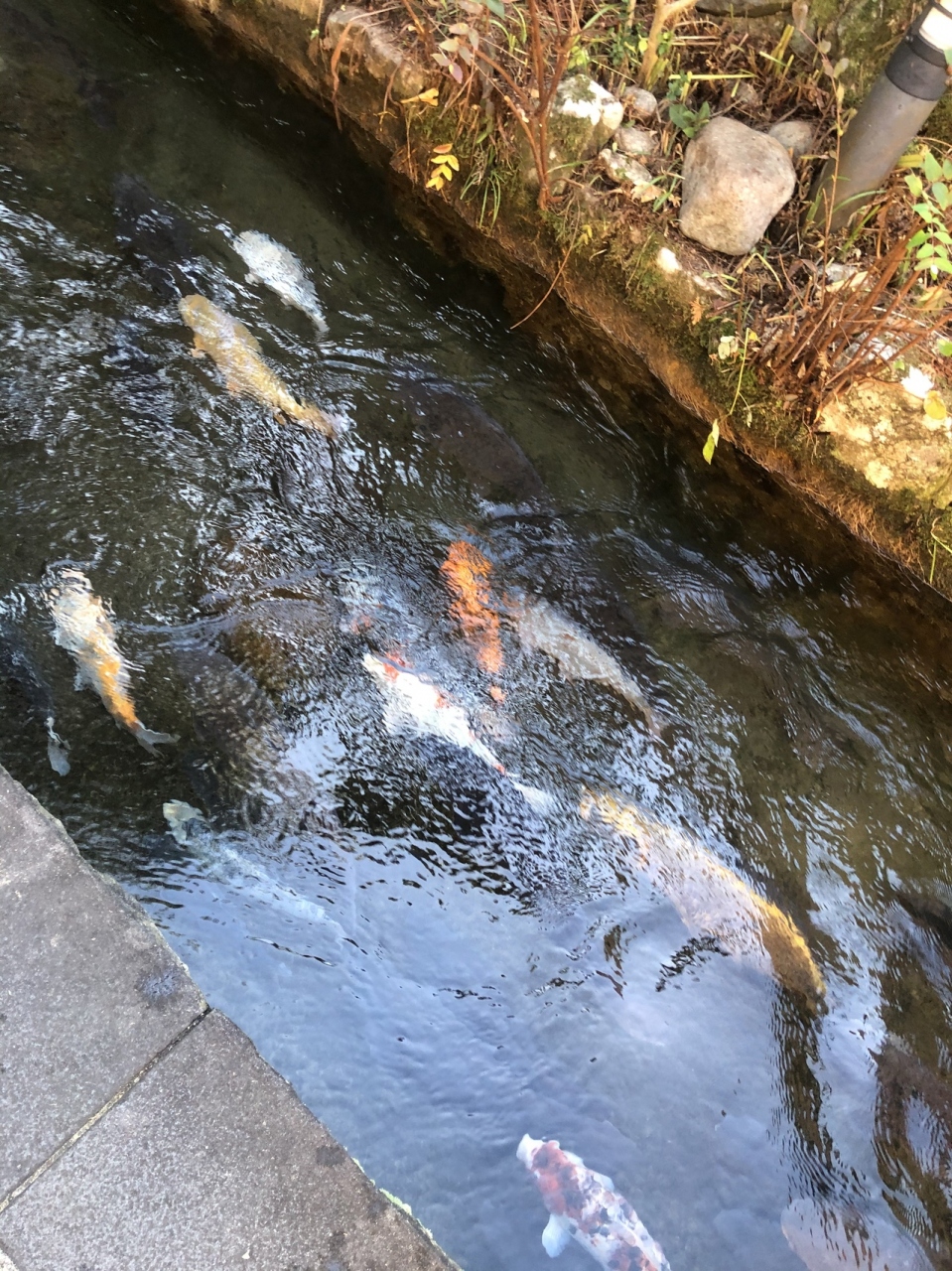 入り口はちょっと解りにくくて、たまたま歩いてたら見つけました。長い用水路には鯉や魚が泳いでいて、水が凄く綺麗でした。泳いでいる鯉も大きいです(≧∀≦)♫餌も売っていてたくさん入ってて100円で、鯉に餌やりが出来て、楽しかったです。