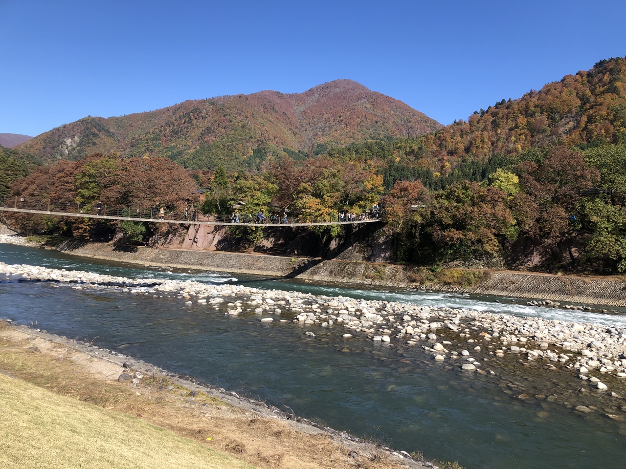 合掌作りの集落と駐車場を結ぶ吊り橋です。幅もあるので、人通りが多くてもすれ違えるけど、少し揺れて怖いです。開放感があって、ここから見える景色は絶景です。川も山も白川郷の集落も全て見えて写真撮ってる人も多かったです。
