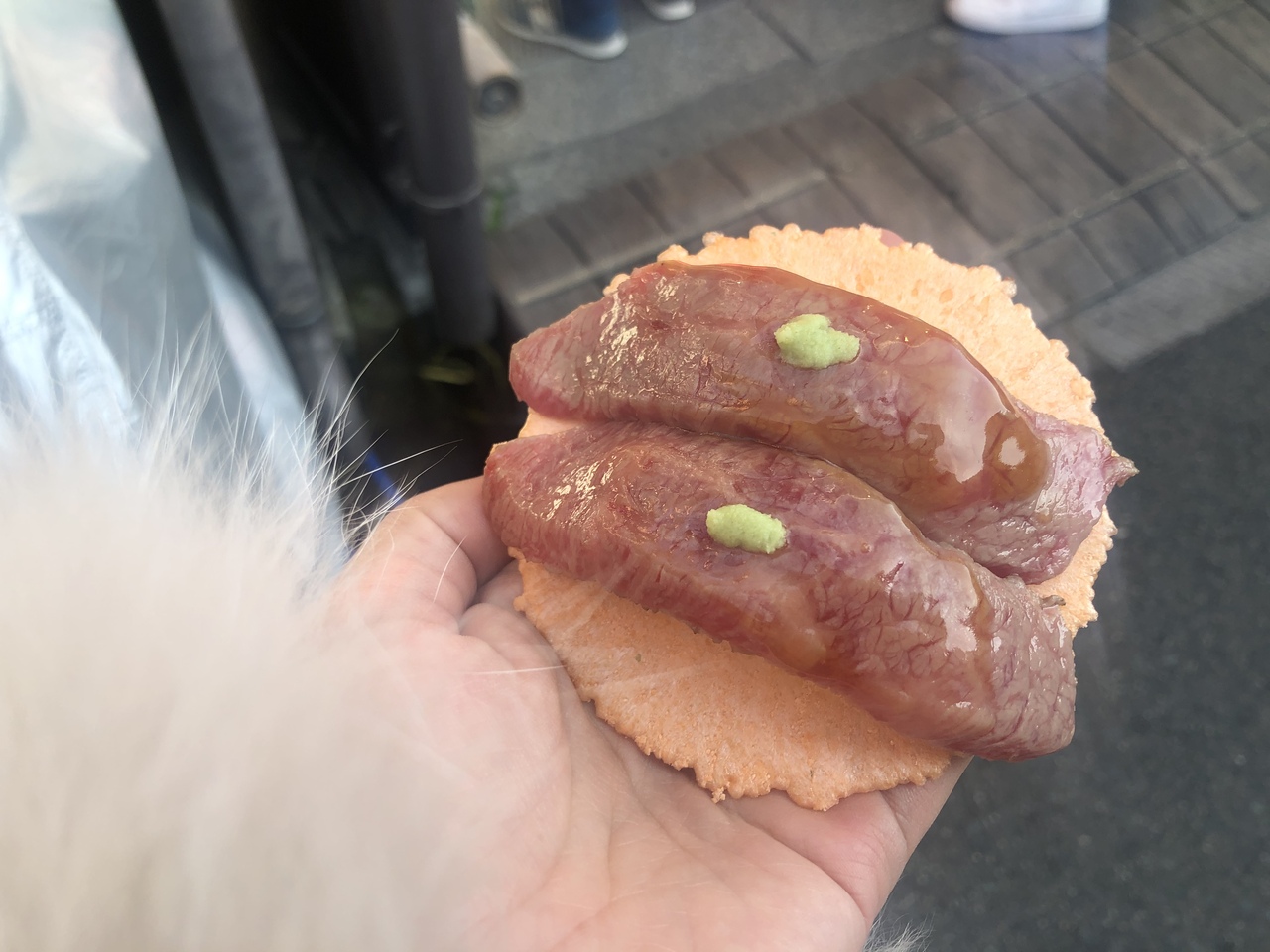 何軒か飛騨にぎりのお店ありますが、ここは飛騨牛にぎり元祖のお店みたいで、祝日に行ったからか結構並んでいました。飛騨牛にぎりも3種類くらいあり、1人前700円の中間のにしましたが、お肉がとても柔らかかくて本当に美味しかったです❤︎