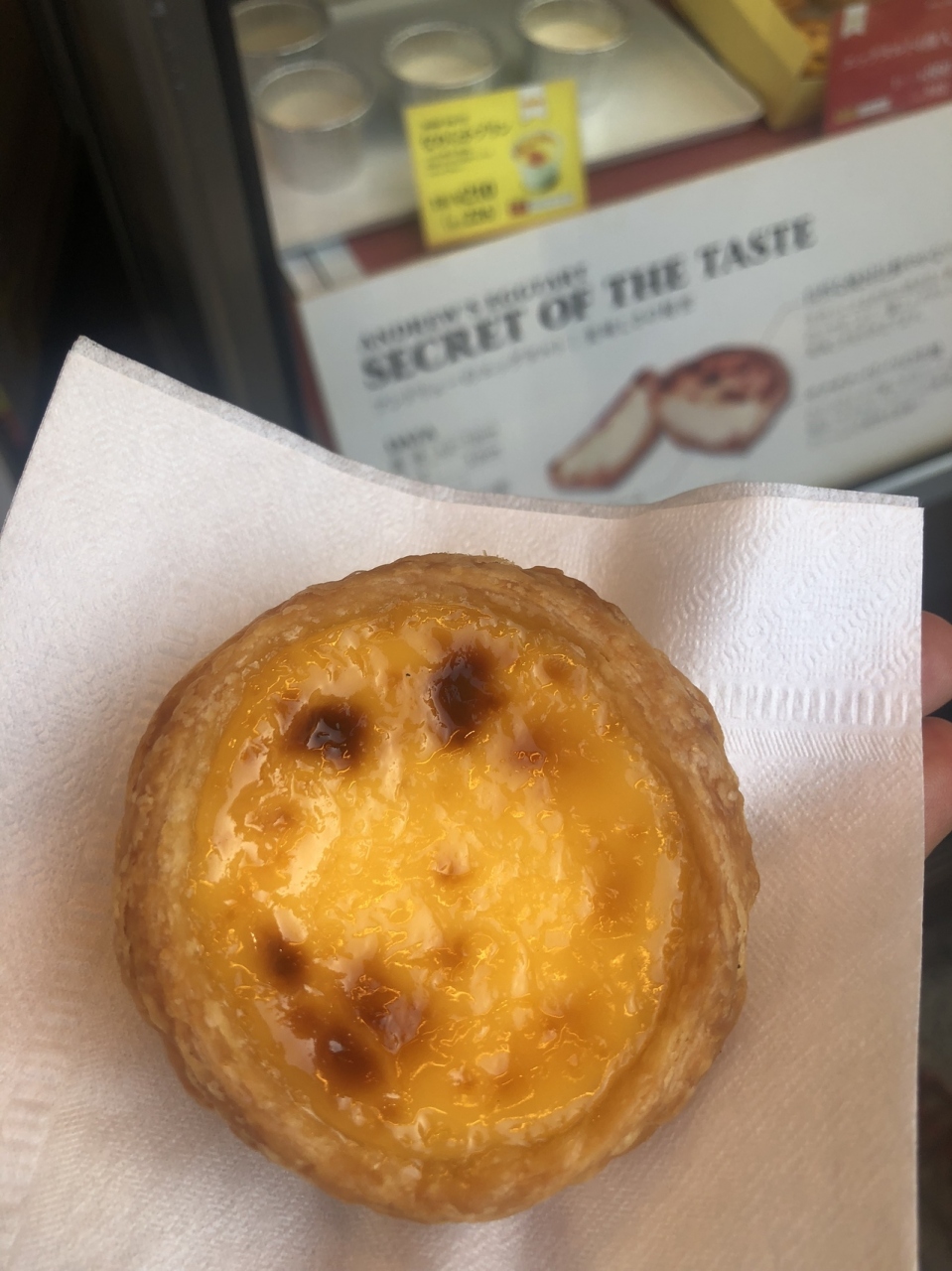 エッグタルトの味は濃厚な卵の味でコクがあって美味しくて、味も定番のエッグタルトだけでは無く抹茶やキャラメルなど種類もいっぱいあります★私が食べた時は出来立てでは無く時間が経過していたからパイ生地が固くなってしまって、温めて食べるともっとサクサクして美味しかったと思います。