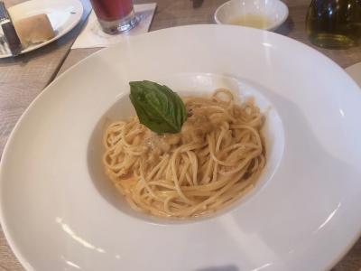 生雲丹パスタがおススメらしくて、ランチでコースを頼みました。サラダにフォカッチャ、最後にパスタ★雲丹がたっぷり濃厚で美味しかったけど、お腹いっぱいで濃厚すぎて。雲丹たっぷりで美味しかったけど、お値段はとっても高かった。