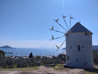 フォトジェニックスポットの白いギリシャ風車がある、小豆島オリーブ公園。