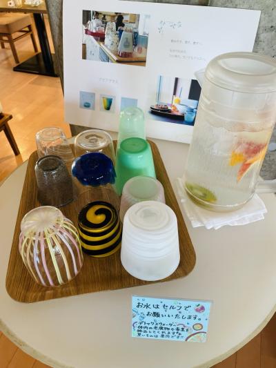 『富山ガラス工房』に併設されているため、オシャレな富山ガラスのグラスが用意されていて、自分好みのグラスでお水が飲めます。