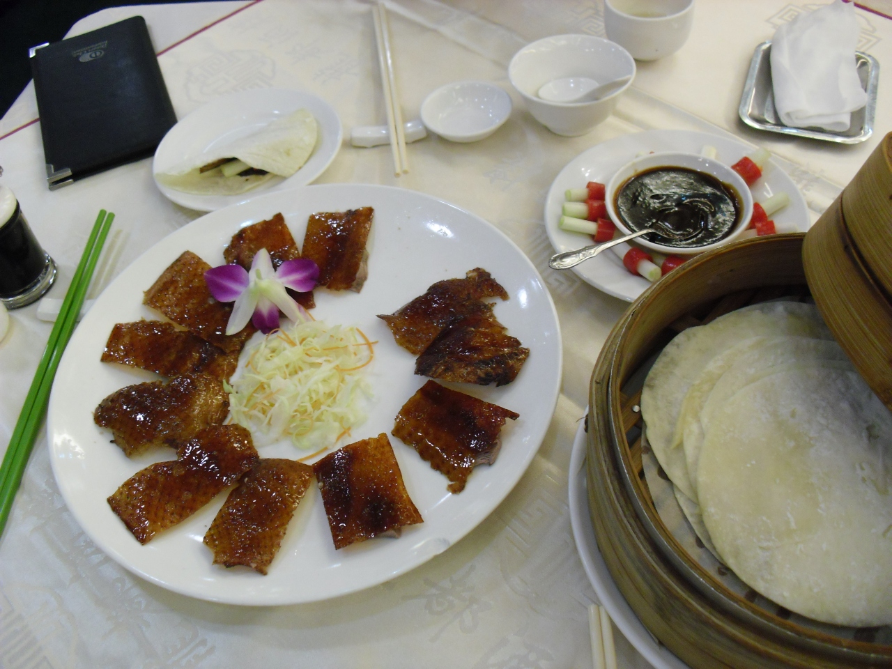 台湾に到着した日に、翌々日の予約を宿泊したホテルのコンシェルジュからしてもらいました。18:00の予約でお店に伺ったところお客さんはほとんどいませんでした。二人だったので、広東ダックは半身予約しました。半身で15切れで、二人で食べると贅沢な事にちょっと飽きます。あとは、小吃2種類程度でおなかいっぱいになってしまいます。やはり、多人数で行かないと楽しめないですね。八角の香りが苦手な方はあまり楽しめないかもしれません。
