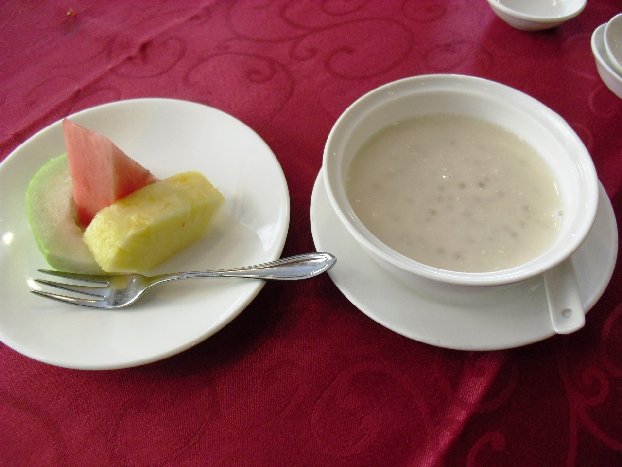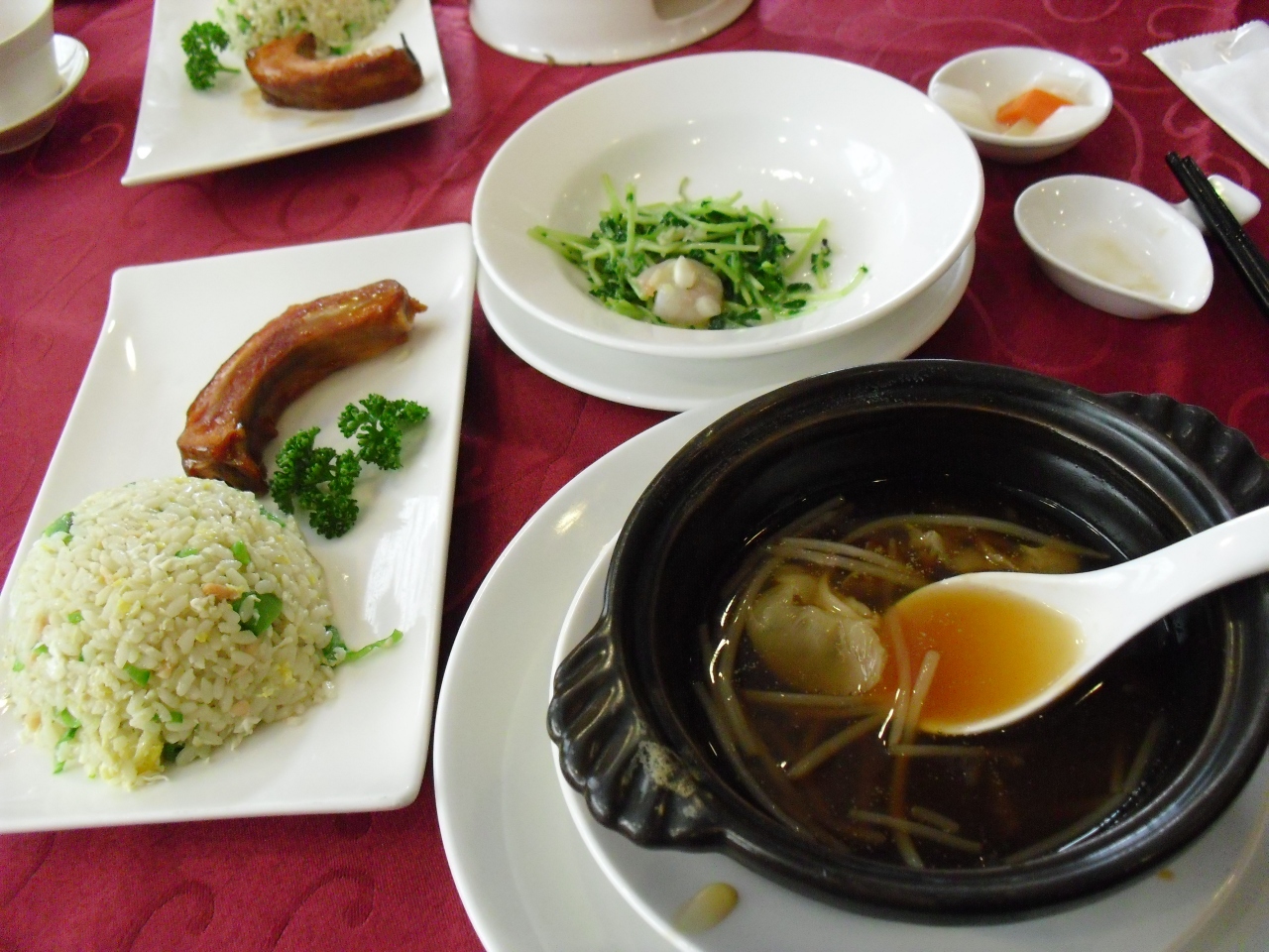 MRT『行天宮駅」から徒歩5分のガーラホテルの2階にあります。私が台湾旅行をを決めたのは、たまたま見た深夜テレビの影響からです。この番組の一押しフカヒレランチ350元也。前菜に野菜の酢漬けが出て、お待ちかねのフカヒレ。小さいながらも、しっかりフカヒレの形で煮込まれています。同じ小さなフカヒレでも横浜中華街とは大違い。コースのように順番に出てきます。次がエビと豆苗の炒め、スペアリブと鮭チャーハンとホテルのレストランなので、きちんと給仕されます。デザートにフルーツとタピオカココナッツミルクが来て、最後にコーヒー。これで350元は大変お勧めです。ゆっくりランチを楽しみました。