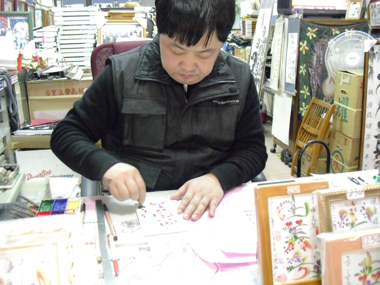 ナイト九フンのツアーで行きましたが、夕食後のフリータイムで真っ先に向かったお店です。店頭で、書いていただく名前と四字熟語(健康美麗とか家内安全とか)を選んで注文紙に記入し、店主さんに渡すと、目の前で書いてくれます。5~10分位で仕上がります。巧みな筆使い・色使いに目を見張ります。下の名前で3文字程度なら、はがき大の大きさで木製フレーム付きで250元。友人のお土産には「○○家」と書いてもらったものを差し上げましたが、家族みんなで喜んでくれました。書いてもらっている人がいると、その実演を見て、このお店を知らなかった人も集まってきて、お店の前が人だかりで注文が増え、時間がかかります。こちらに行こうと思っている方は、真っ先にこちらに行き、その後ゆっくりと芋圓のお店に行く方が良いと思います。