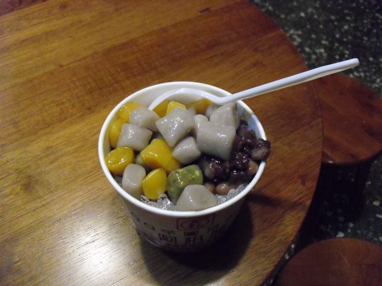 夜の九ふん観光ツアーで行きました。食事が着いていたので、食後のデザートのつもりで行きました。階段を上り、一番高い所まで来たという感じで歩きました。友人が温かい芋圓、私が冷たい芋圓+練乳を食べましたが、冷たい方に軍配が上がりました。階段を上ってくるので体が温かくなるので冷たくてもOKです。温かい方は味が薄くてぼやけているように感じました。注意は芋圓はずっしり重たいので食後には少しきついです。おなかいっぱいになりました。